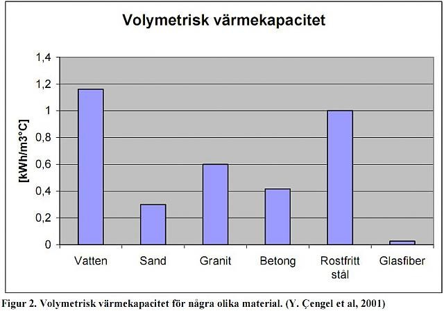 Hur som helst, mitt mål är att använda så lite el som möjligt och ändå hålla minst 20 grader inne. Insatsen är på 9 kw och inga som helst problem att hålla varmt även när det är -25 så länge jag eldar. Jag antar att 3kw kommer räcka till de flesta dagarna på året, dvs 3x24=72kwh på ett dygn. Mellan 17-22 eldar jag och sista brasan slocknar kl 00.00 då har jag 15 timmar kvar tills jag eldar igen. 12kwh finns lagrat i varmvattenberedaren och räcker då 4 timmar. 11 timmar kvar. Golvvärmeslingorna kommer ligga i ett 2cm tjockt lager sand och ett lager plåtskiva på toppen varpå clickgolvet kommer ligga. Ca 800 liter sand kommer det finnas på golvet. Jag kan inte hitta hur mycket värme sand lagrar. Vatten lagrar ca 60 watt per liter om man kan utnyttja 50 grader. Sanden på golvet kommer kunna vara minst 40 grader(för varmt jag vet men golvet och hela huset ska rivas om några år och ingen kommer vistas på golvet mer än en timme så ingen lär bli sjuk heller) och då kan jag utnyttja 20 grader. Så frågan är helt enkelt hur mycket energi sand lagrar? Anta att det är hälften av vatten så kommer sanden lagra 24kwh dvs 8 timmar. Bara 3 timmar som elpatronen behöver gå för att hålla 20 grader inne.