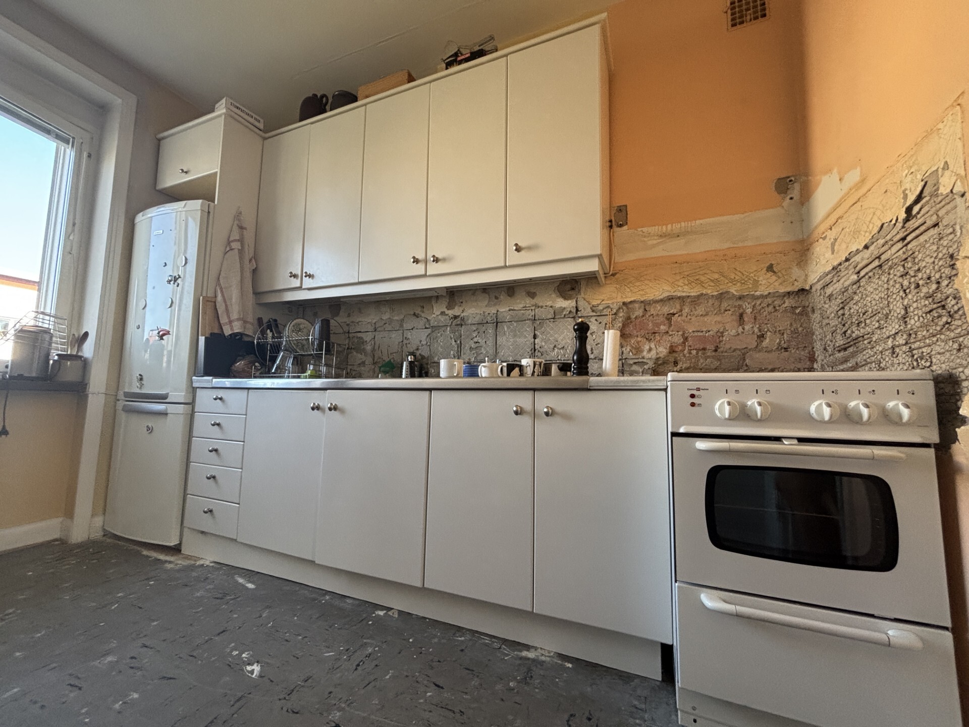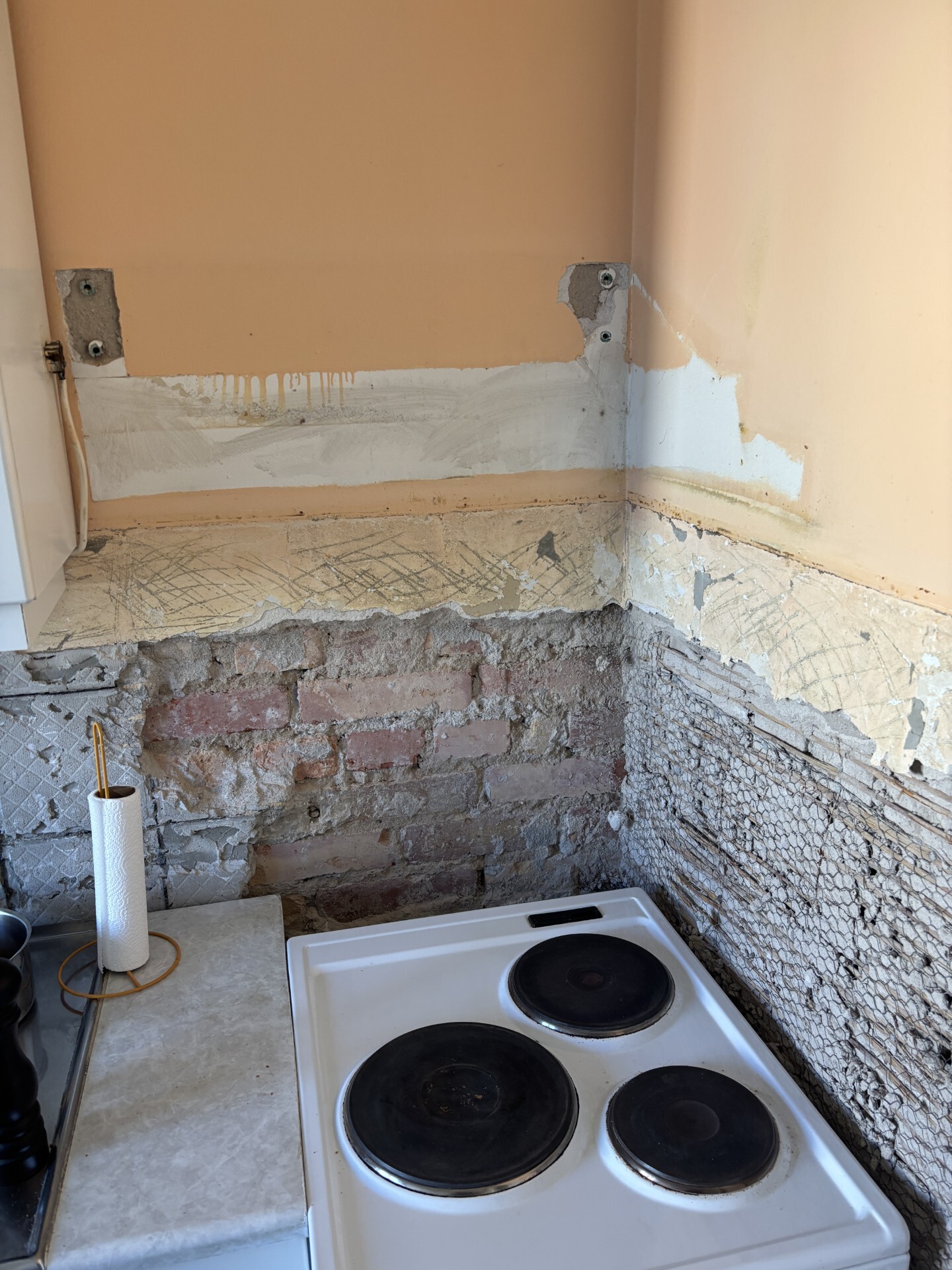 Vi har påbörjat ett projekt med att kakla om i köket och har därför tagit ner allt gammalt kakel. Halva väggen följde tyvärr med på ena sidan och vi fick råd på byggvaruhus att köpa husfix att kladda på/laga väggen.
