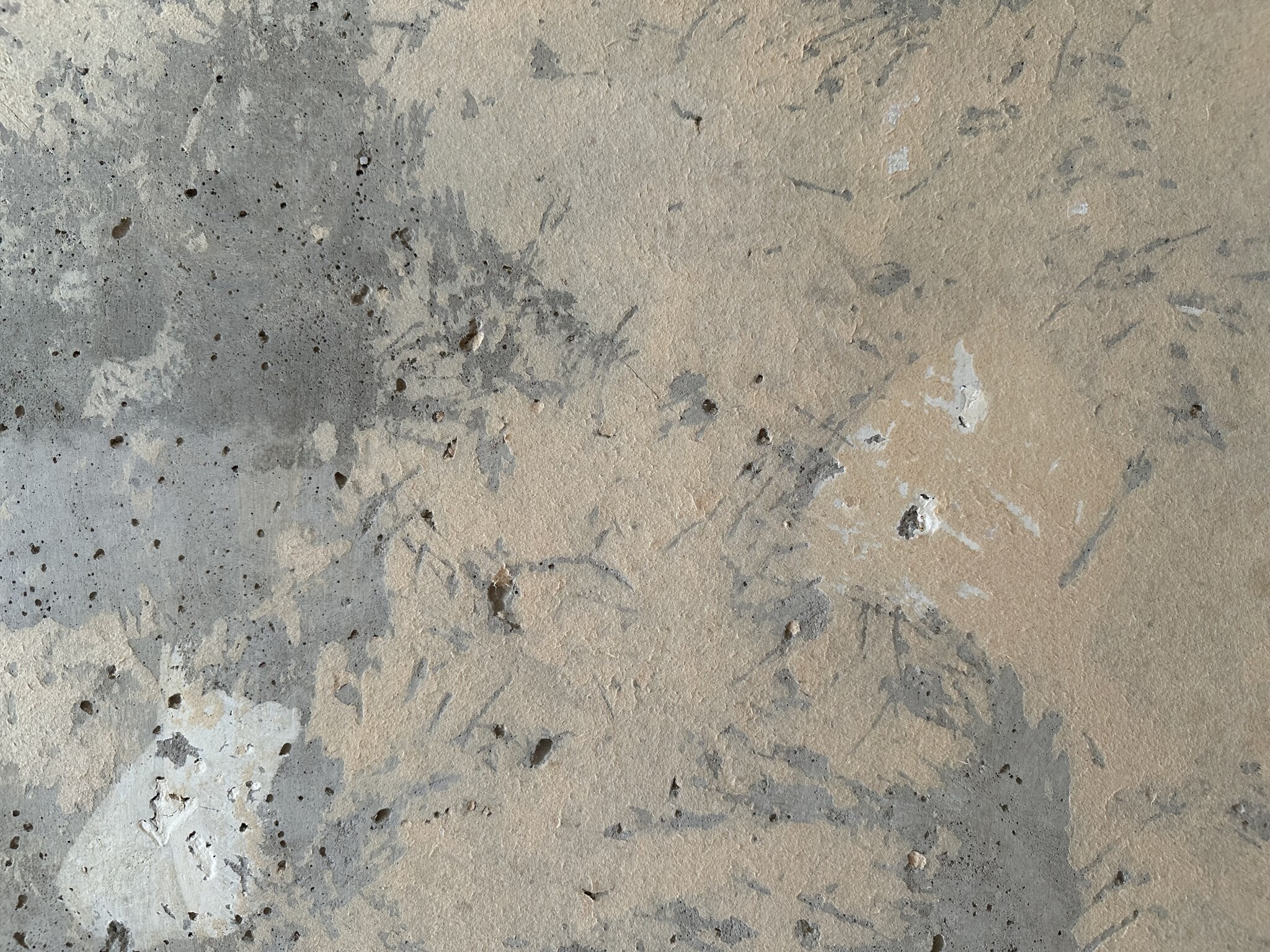 På betongen. Rolla på ett tjockt lager med tapeklister och täck med gladpack, låt det sitta något dygn. Så går det att skrapa/skära av med en spackelspade. Men betänk, det blir riktigt kladdigt så täck golvet ordentligt och ha plasthandskar på.