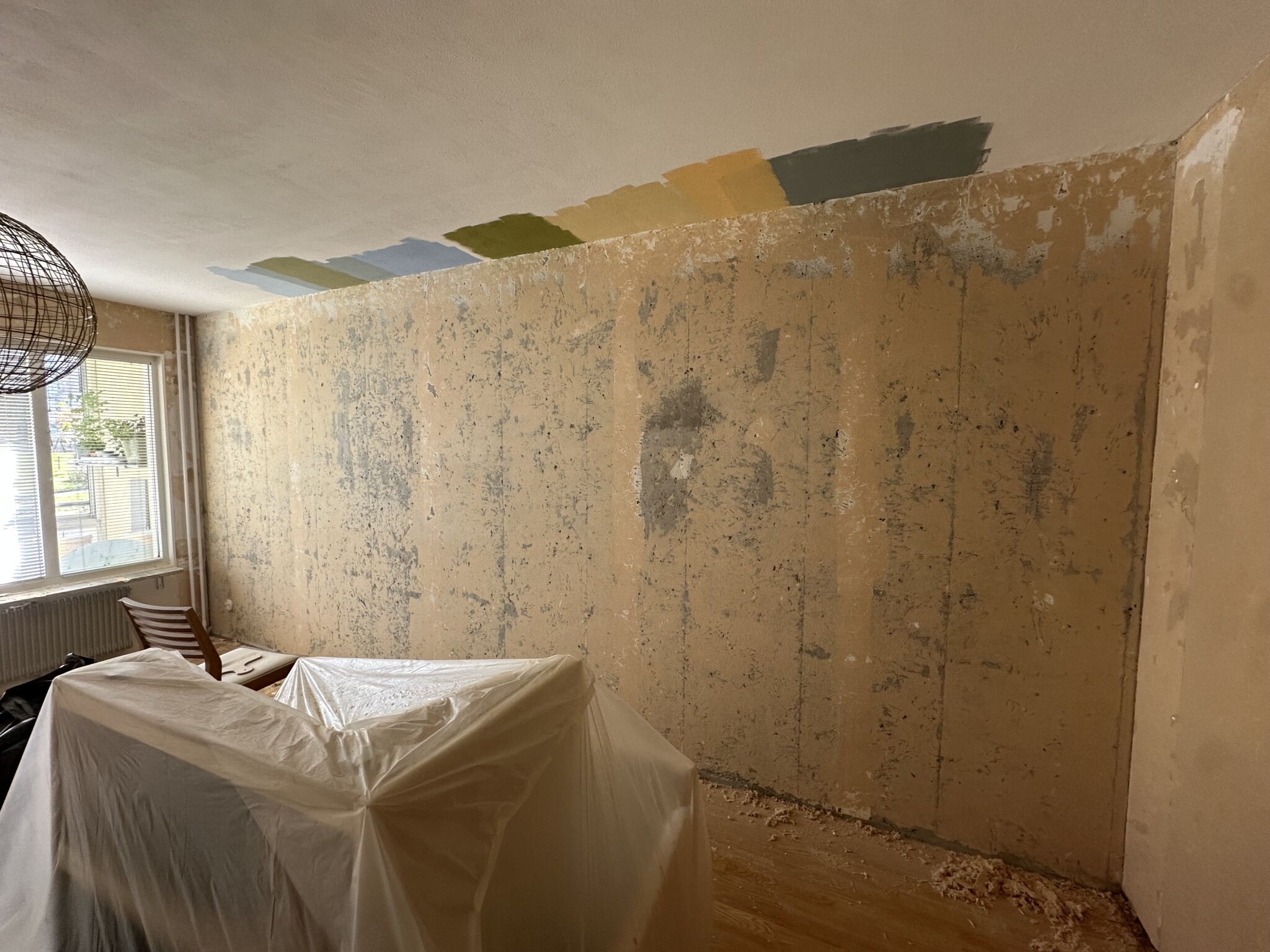 Hur ska du slipa väggen sen? För jag har börjar slipa väggen med giraffen innan jag börjar spackla just för att få bort småbitar.