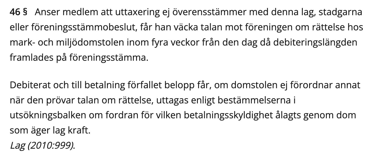Nej, det du beskriver nu är precis som i fallet med TS samfällighet där man gör saker inom samfälligheten trots att det inte är med i anläggningsbeslut.H hempularen skrev:Fast det finns ju en risk med detta. Även om alla är överens om investeringen. Så kan man få problem senare med driften. Antag att alla är med på investeringen för ex- 1 miljon. Sedan om 5 år måste någonting repareras för 5 000 kr. Om en medlem klagar då på att föreningen spenderar pengar på något som ligger utanför anläggningsbeslutet så kan det bli problem. Eller om man har lånat till investeringen, och någon klagar något år senare på att föreningen betalar ränta.