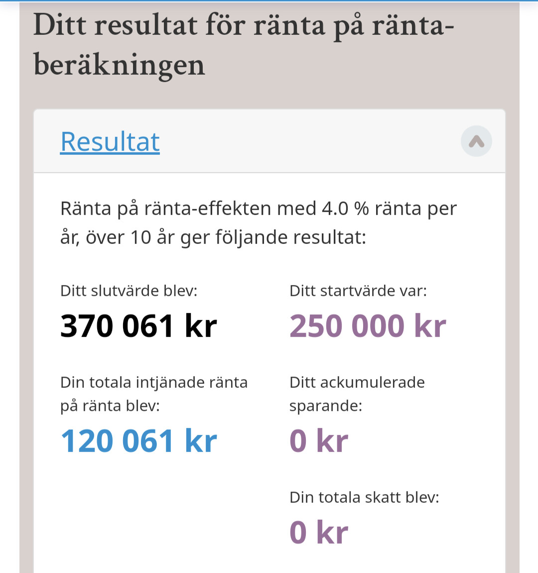 Synd att tiden för att motionera till stämman har gått ut. Om man ändå struntar i vad anläggningsbeslutet säger så kan vi ju lika gärna sätta in 250000 kr på räntebärande konto med 4 procent avkastning istället och få tillbaka totalt 370 061 kr efter tio år (exkl skatt). Solcellsentusiasten som drivit frågan menar att vi "fått tillbaka" pengarna på 8-10 år, dvs 250000 kr. Jag har inte sett något om det ingår diskontering/nuvärdesberäkning då (250000 kr nu är mycket mer värt än 250000 kr utbetalat uppdelat under 10 år från nu).