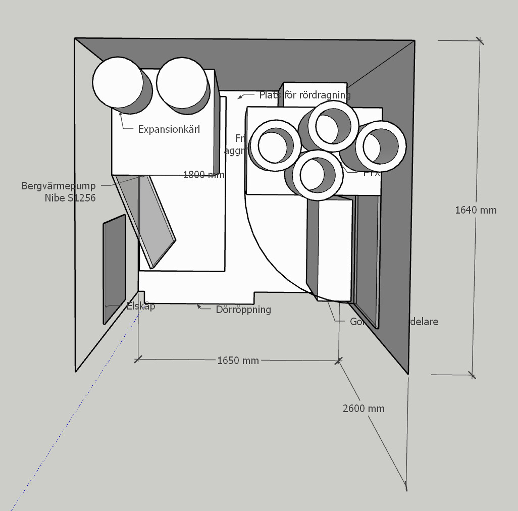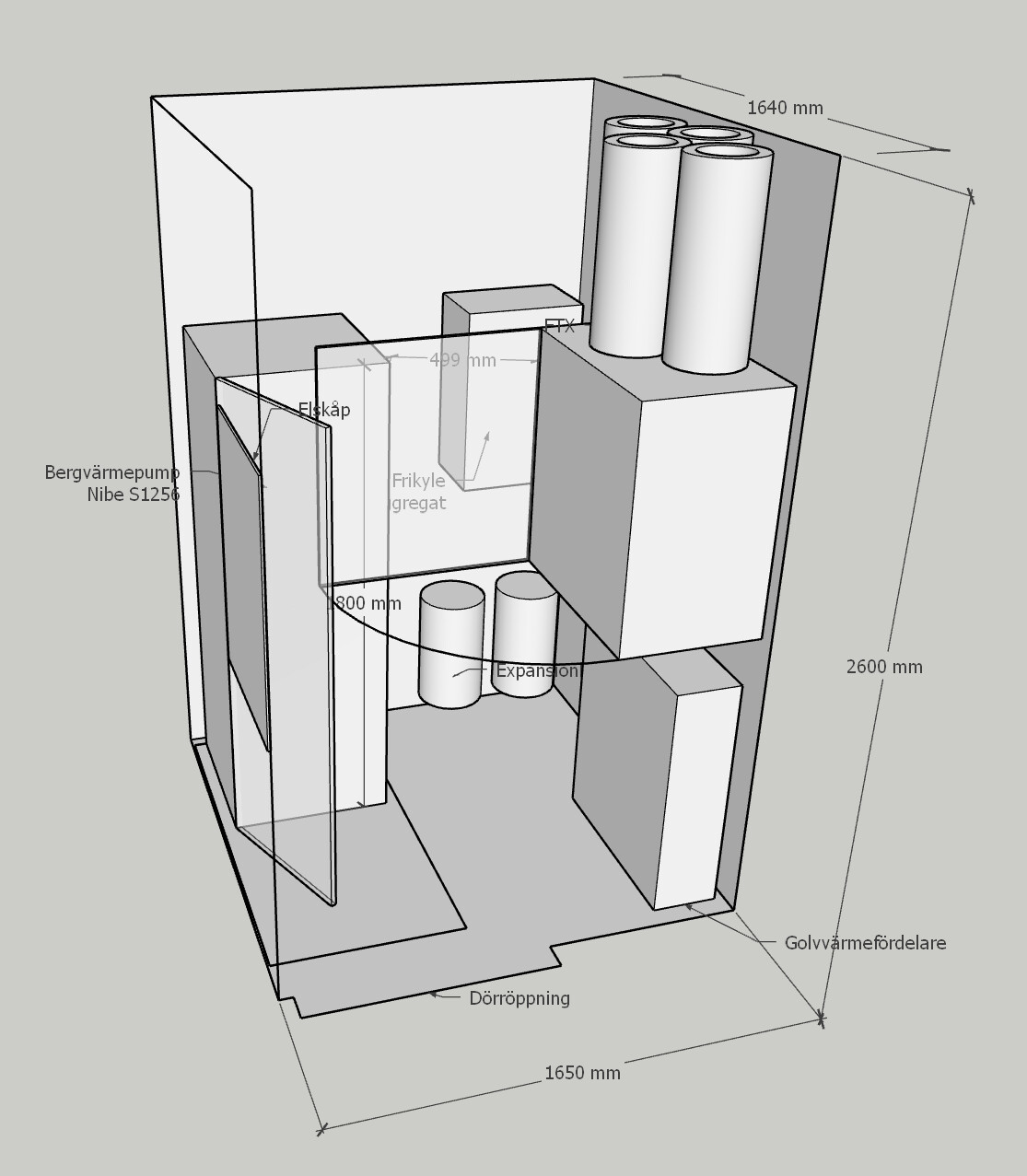 Rummet för tekniken är rätt litet och jag tror inte jag kan få till det större utan att "förstöra" planlösningen, och jag behöver hjälp med att bedömma om det det går att få plats med all utrustning i rummet och samtidigt komma åt för service mm. Mest intressant är att veta om all kringutrustning som hör till värmepumpen med frikyla (expansionskärl, rördragning, frikyleaggregat, kylbatteri (ej med på bilderna)) får plats i rummet och kan kommas åt i efterhand.