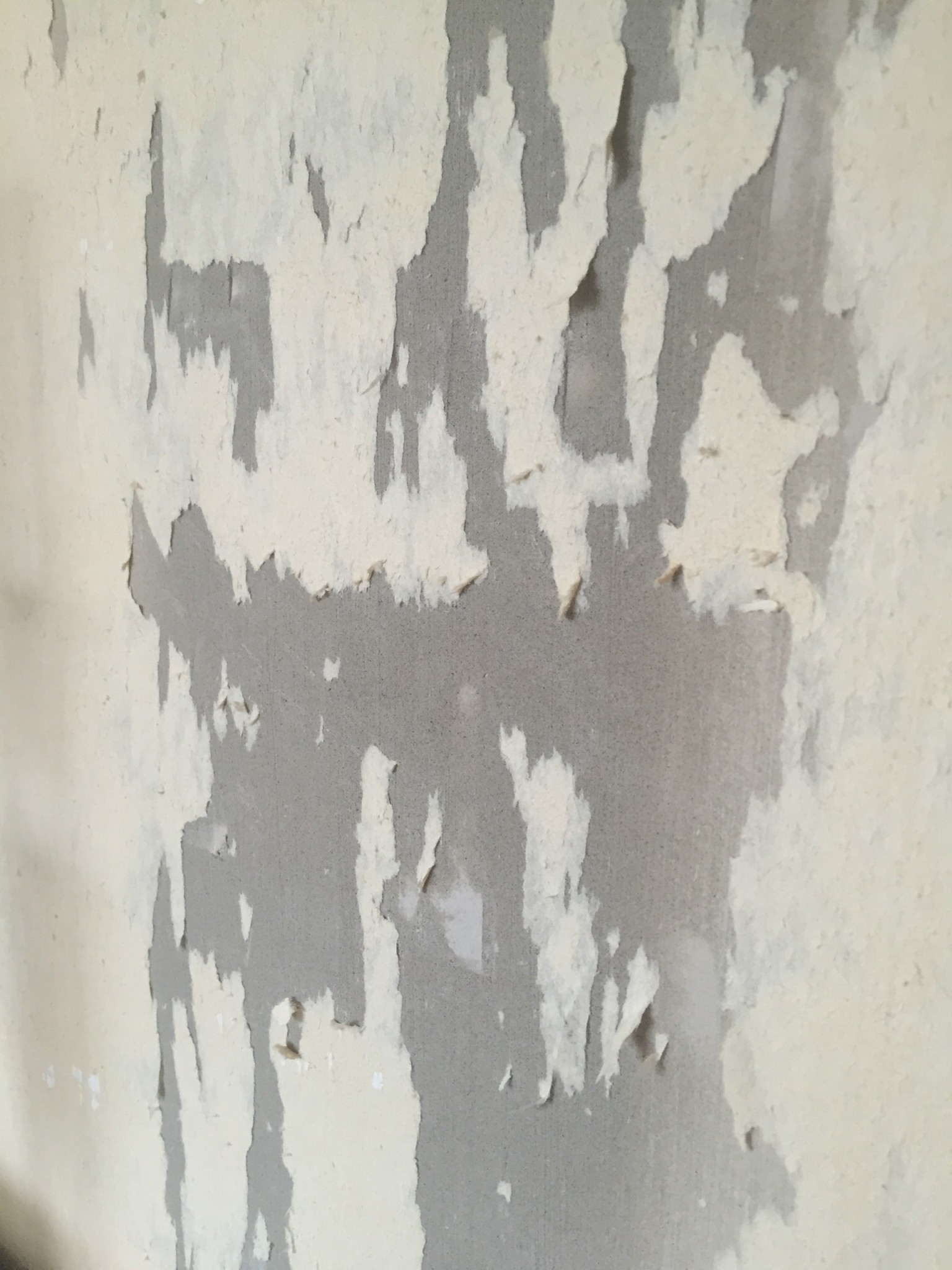 Hur mycket av den gamla tapeten ska tas bort? Måste gipsskivan vara helt ren? Måste varenda liten pappersbit bort? Kolla på bilden hur det ser ut efter att jag skrapat ner tapeten mot gipsskivan. Jag har inte slipat något alls ännu innan jag vet vilken nivå jag ska lägga mig på.