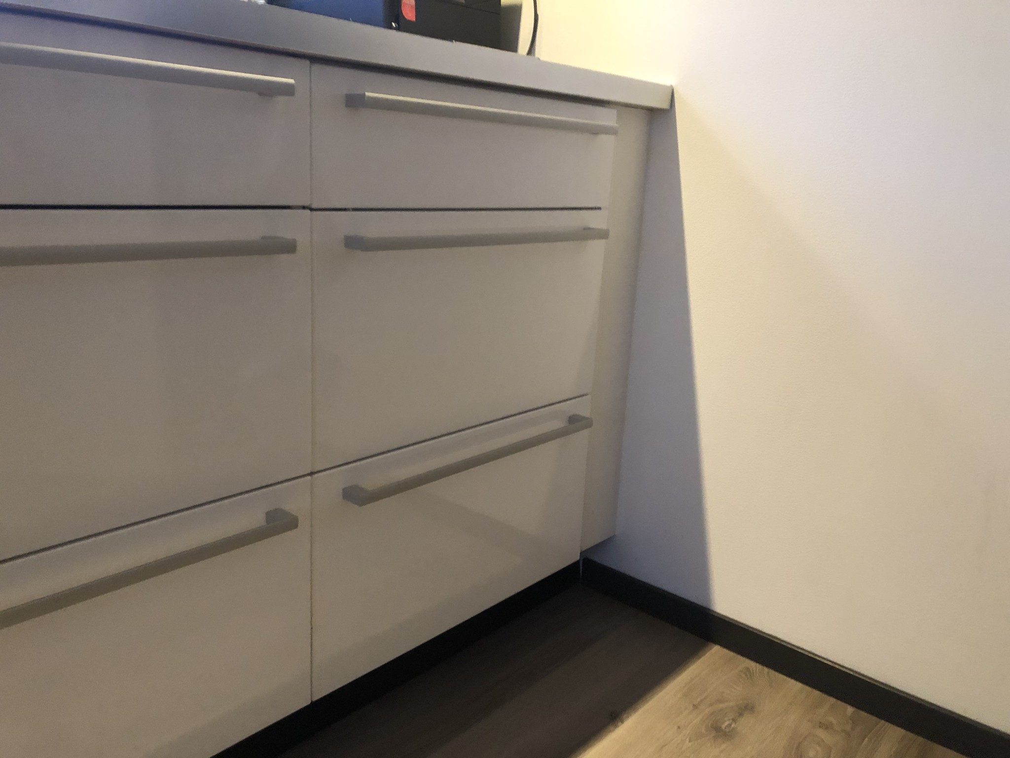 Sedan får man kapa till en passbit och skruva fast med vinklar nedertill som hamnar i höjd med underkant på bänkskåpen.