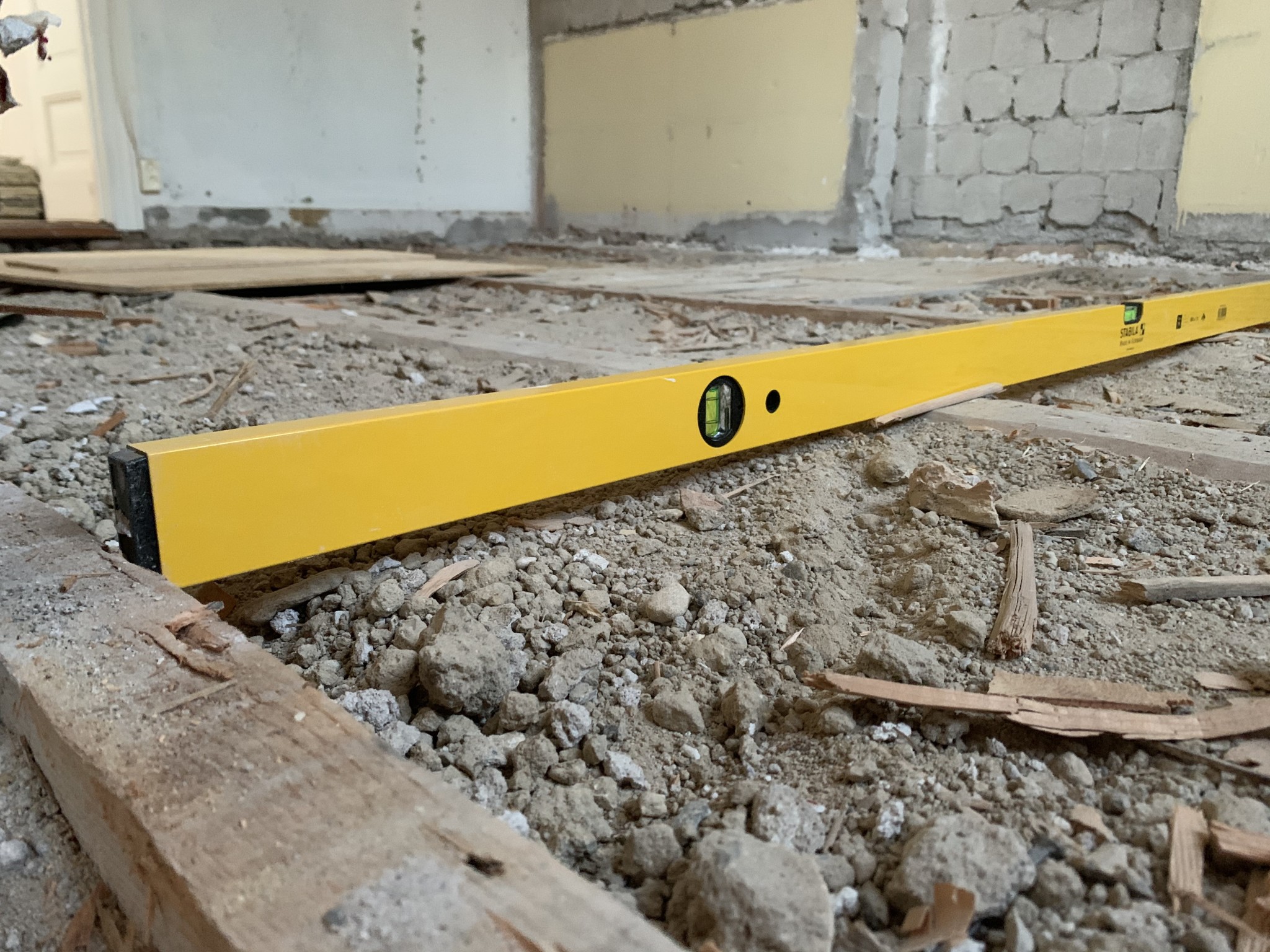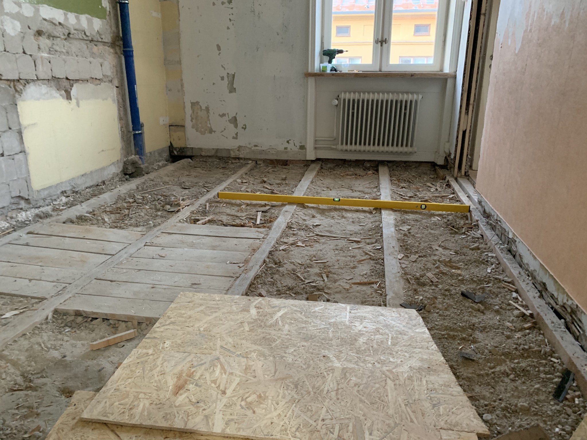 Efter att ha brutit upp det tidigare golvet, som var väldigt sviktande och knarrande (ej original), så märkte jag att alla bjälkarna inte ligger jämnt. Tre av originalbjälkarna ligger bra, en ligger för lågt, och när dom la det förra golvet kompletterande dom med en halvdan regel längs ena väggen. Den var inte tillräckligt lång så lappningar i ändarna har skapat ännu mer instabilitet i det tidigare golvet. Den nylagda regeln ligger högre än alla andra bjälkar, där man lagt läkt för att komma upp i samma nivå. Läkten satt dåligt. Nu undrar jag hur jag ska gå tillväga för att få ett stabilt underlag som håller i längden.