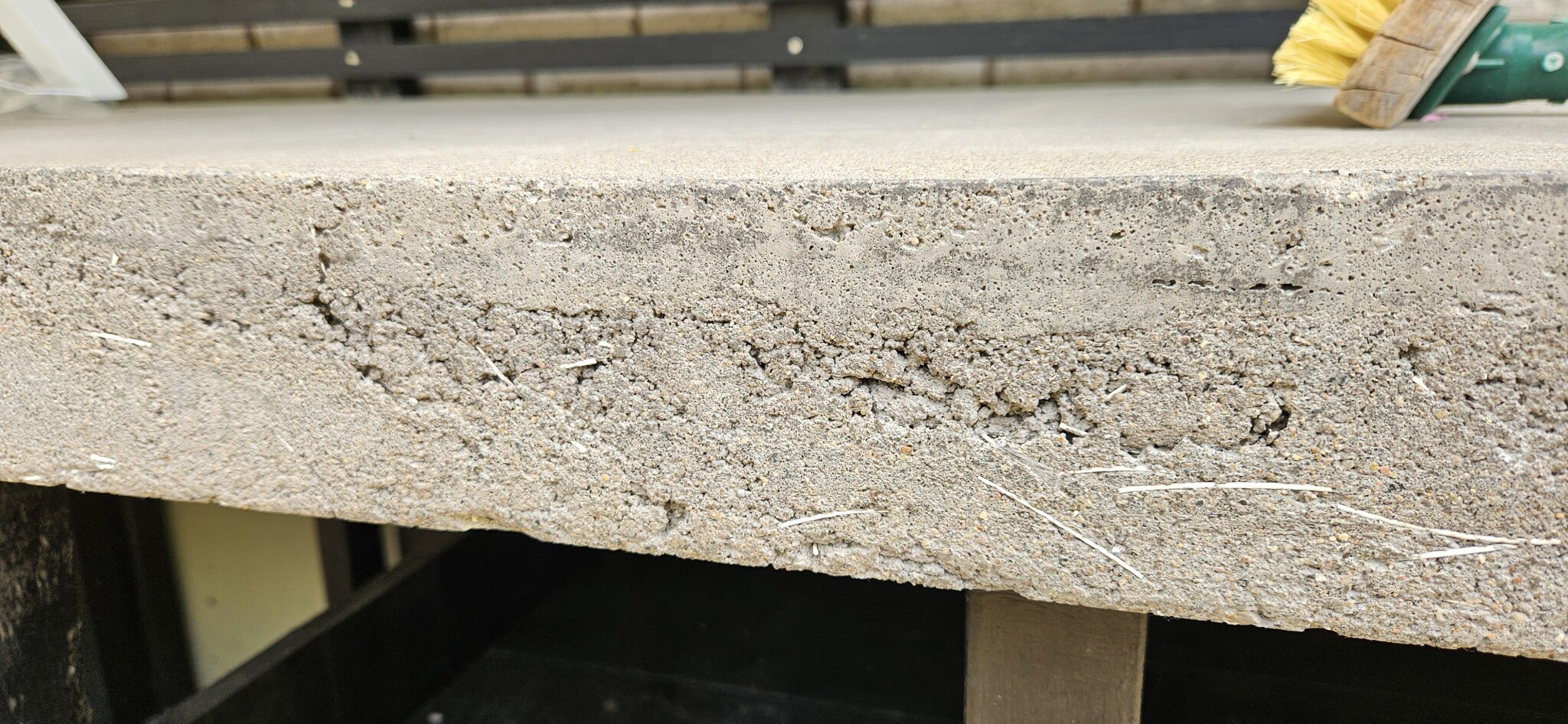 Det jag tänker att jag skulle vilja göra är att sprida ut någon form av betongprodukt ovanpå hela skivan och att detta då skulle täcka upp alla håligheter och att jag skulle kunna forma i framkant för att få hela skivan i samma nivå. Och så någon liknande produkt som skulle kunna fylla upp håligheterna på sidan av skivan.