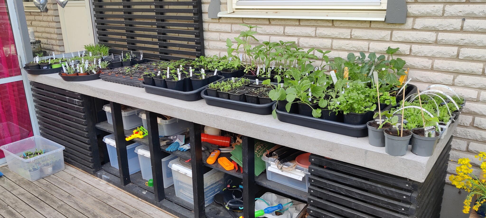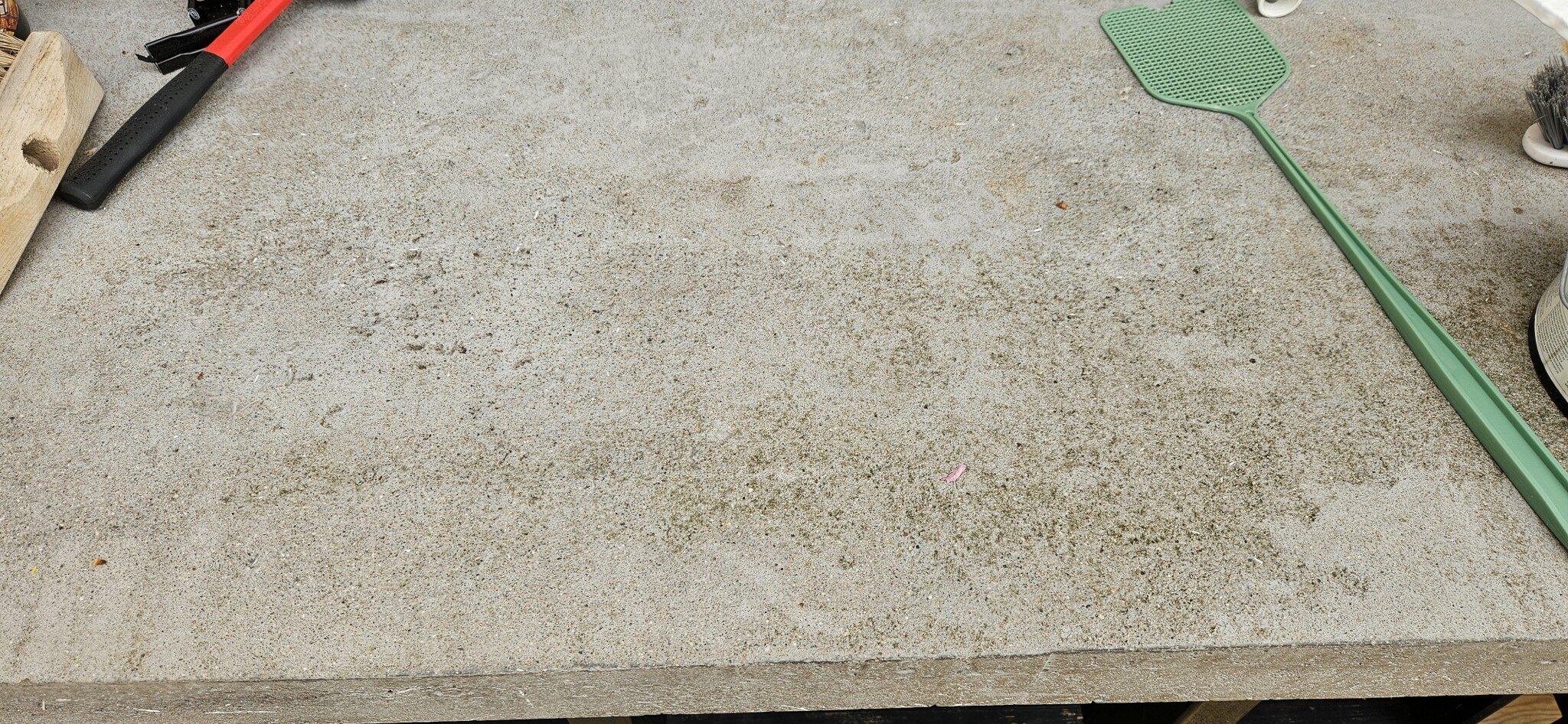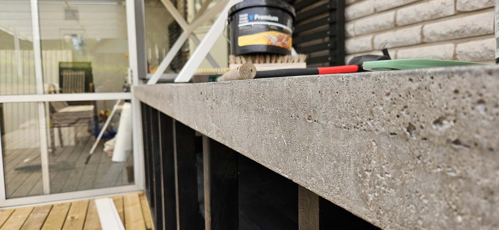 För ungefär fyra år sedan byggde jag ett utekök hemma på altanen och gjöt en bänkskiva i betong, ca 400 gånger 70 cm och ungefär 5 cm tjock med ett överhäng i framkant så att den ser ut att vara ca 10 cm tjock.