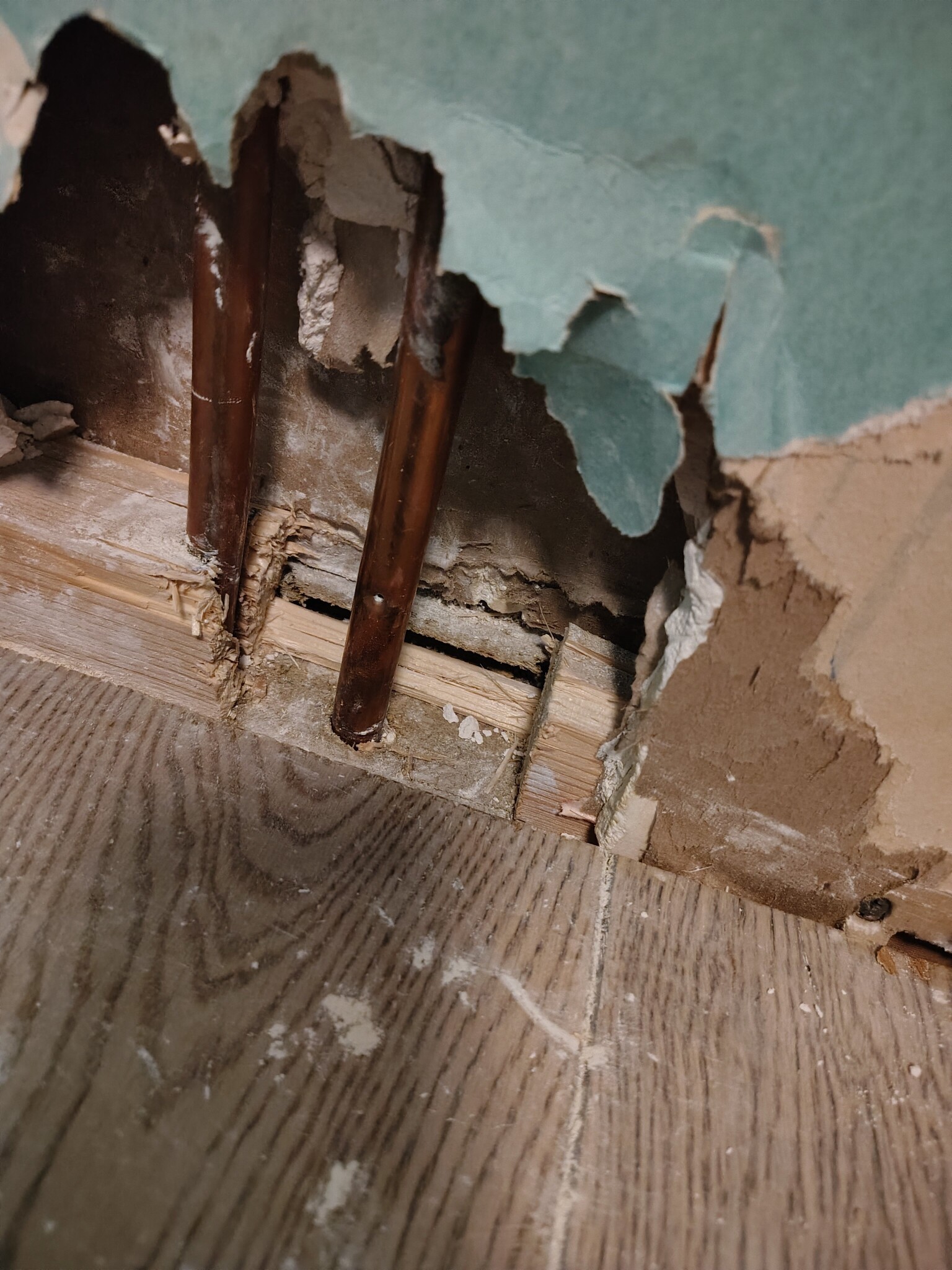Igår skulle jag sätta fast en golvlist i ett av sovrummen på övervåningen, men när jag slog i spiken hördes ett pysande ljud och jag fattade direkt att jag punkterat en vattenledning som går till badrummet på andra sidan väggen. Det tog en stund att stänga av huvudkranen som sitter dumt till och det har runnit/droppat i kökstaket. Uppskattar 2-5 liter totalt som kommit ut i konstruktionen. En jourkille har satt ut två avfuktare. Problemet är nu att jag inte inte har vatten i lägenheten (radhus, bostadsrätt) och jag vet inte hur hålet i kopparröret ska åtgärdas.