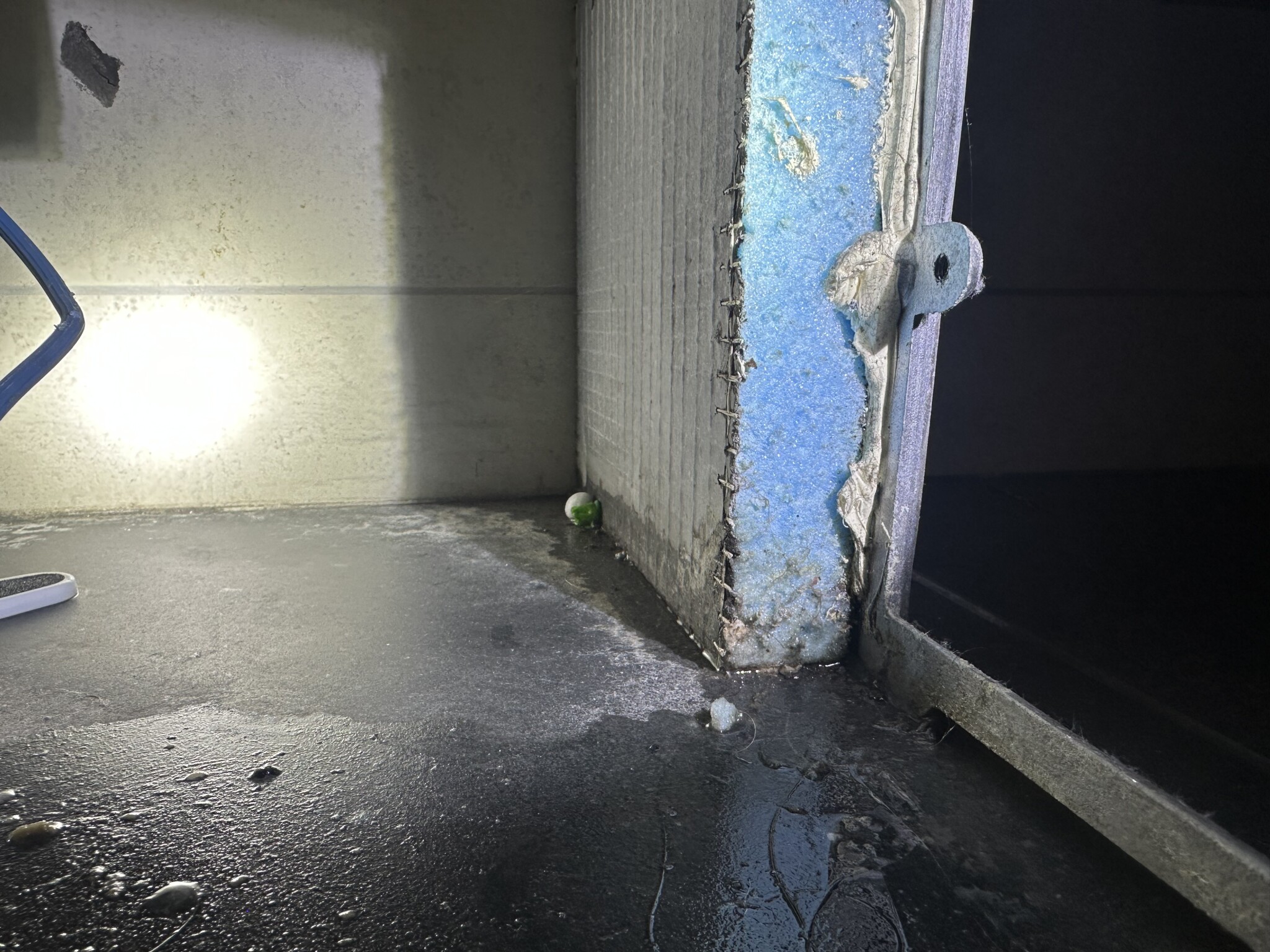 Under spabadet finns det enhetligt kakel och klinker (samma som i resten av badrummet), och jag hoppas kunna frilägga detta igen. I inspektionsluckan syns hårda beläggningar på golvet från duschvatten som blivit liggande länge.