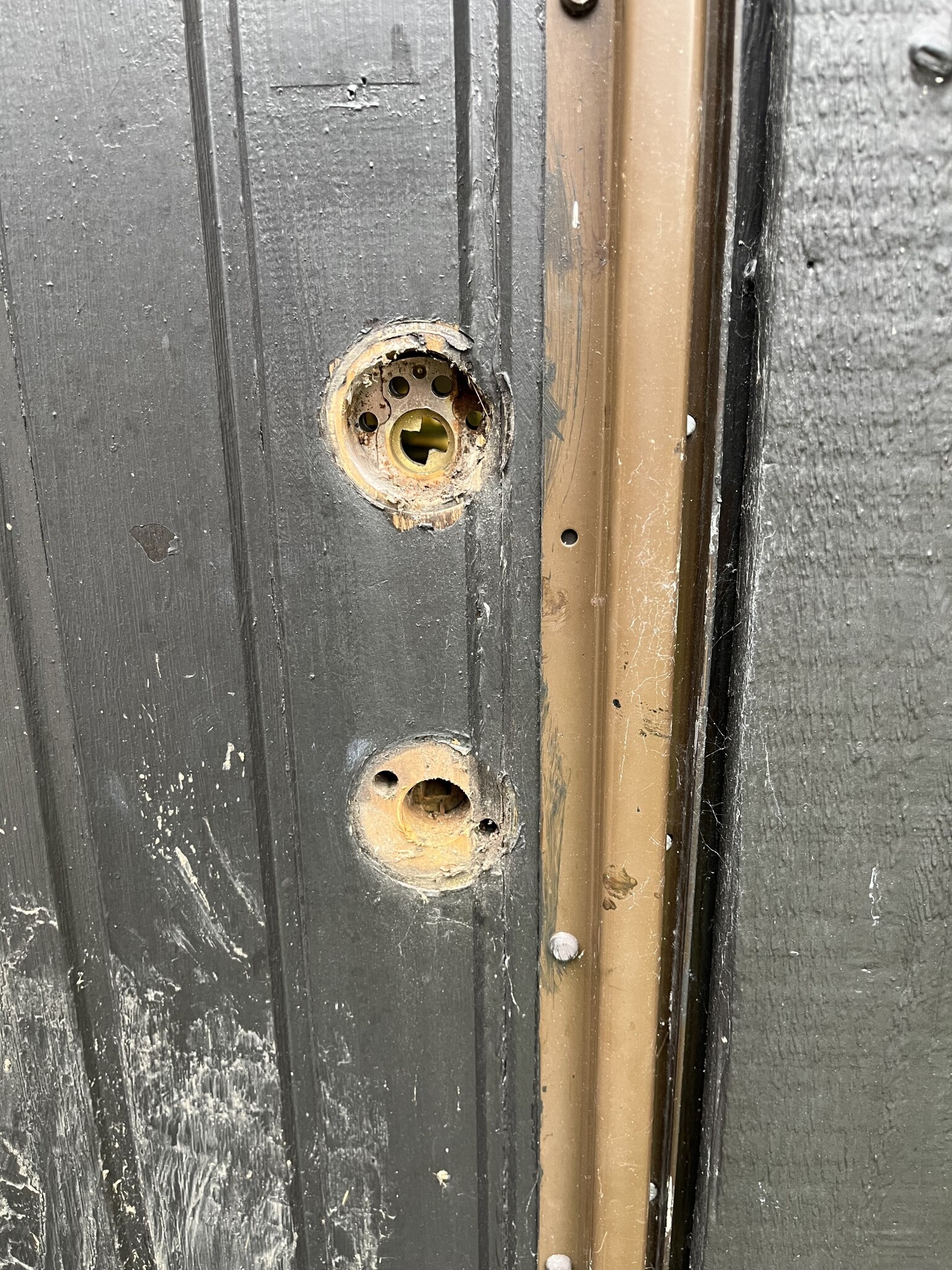 Dörren har gått i baklås. Låset är av ”smäcklås” sorten. Skruvat av allt som går.