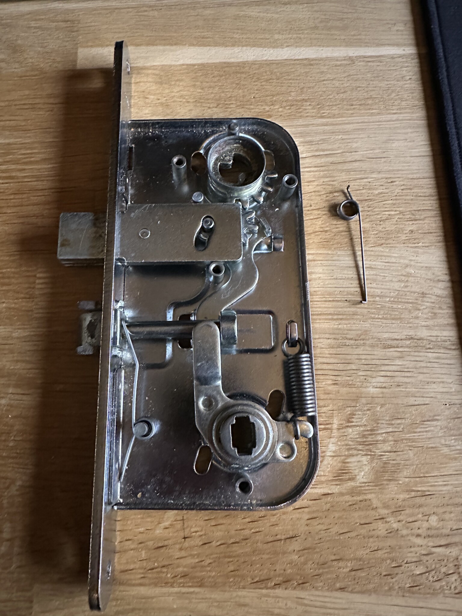Har stirrat på låskistan i timmar utan att finna lösningen. Gissar på att fjädern ska hålla regeln på plats? Har jag lyckat slarva bort och saknar någon del ?