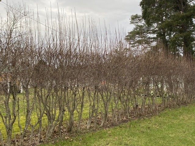 Häckarna var inte helt formklippta eftersom jag tyckte det passade bättre med bara lite formad, men någorlunda rak utsida men lite ojämnt (mer naturligt) upptill. Forsythian klipptes också efter blomningen för att hålla den lagom hög och bred, men inte jämnt toppad utan de längsta grenarna klipptes till ung. en halvmeter under önskad höjd.