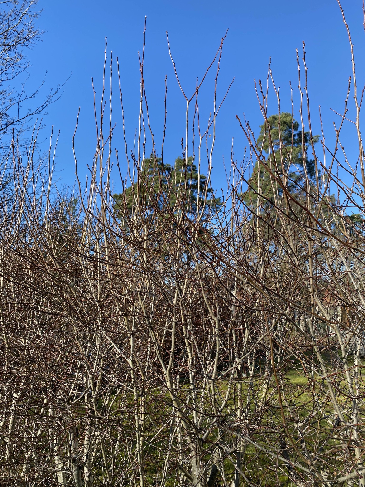 Stammarna är lite varierande i storlek, förgrening och tjocklek. Hur ska jag tänka kring dessa när det gäller vilka och hur många som ska tas ner lågt? Hur mkt av ”riset” upptill borde jag klippa ner? Ska man tänka A-form redan nu eller klippa det när de har blad?