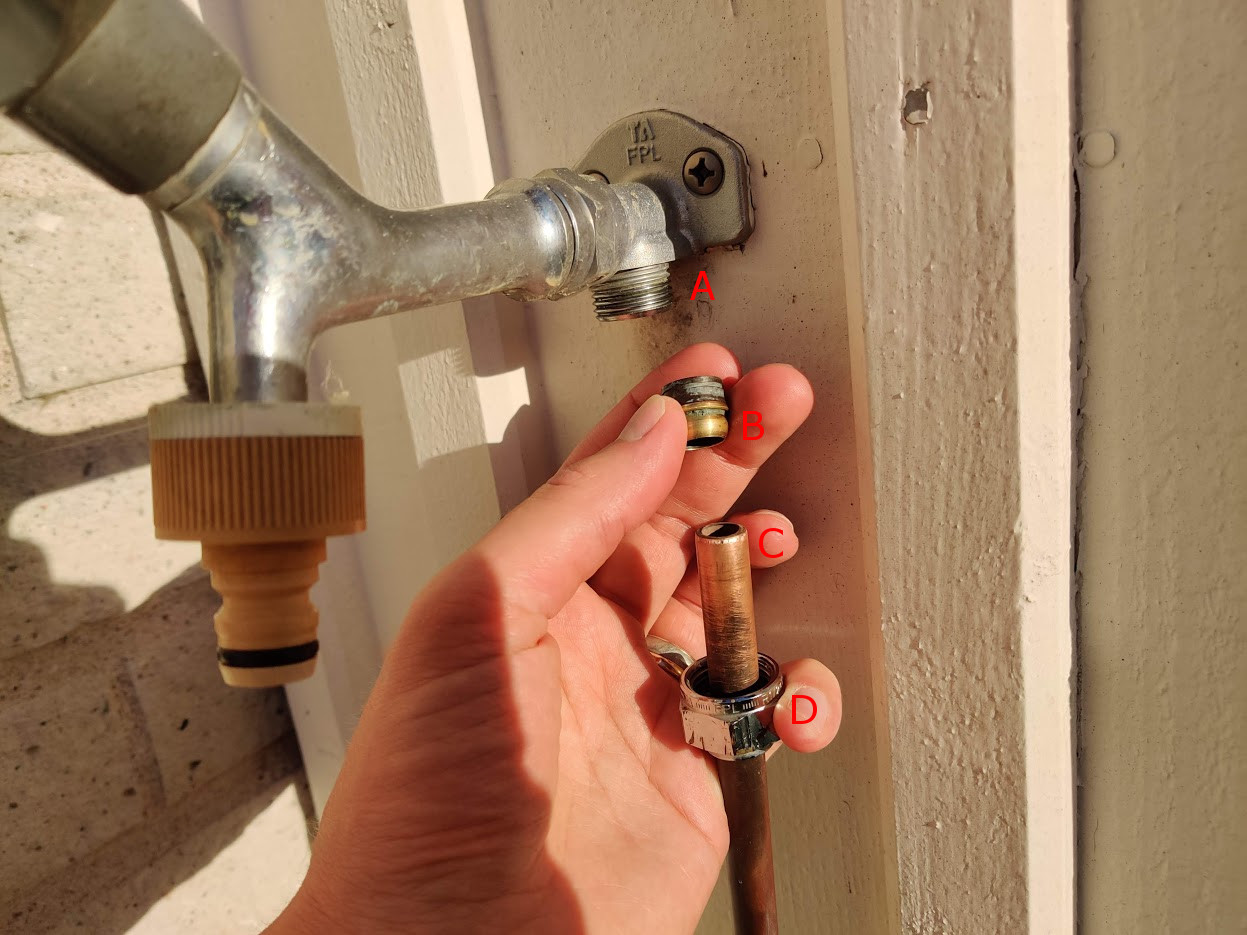 I normala fall trär man konan(?) B över röret C, för in i A och drar åt med D. Men idag gick det inte att trä konan över röret. Jag provade att slipa lite på rörspetsens ytterkant men det hjälpte inte.