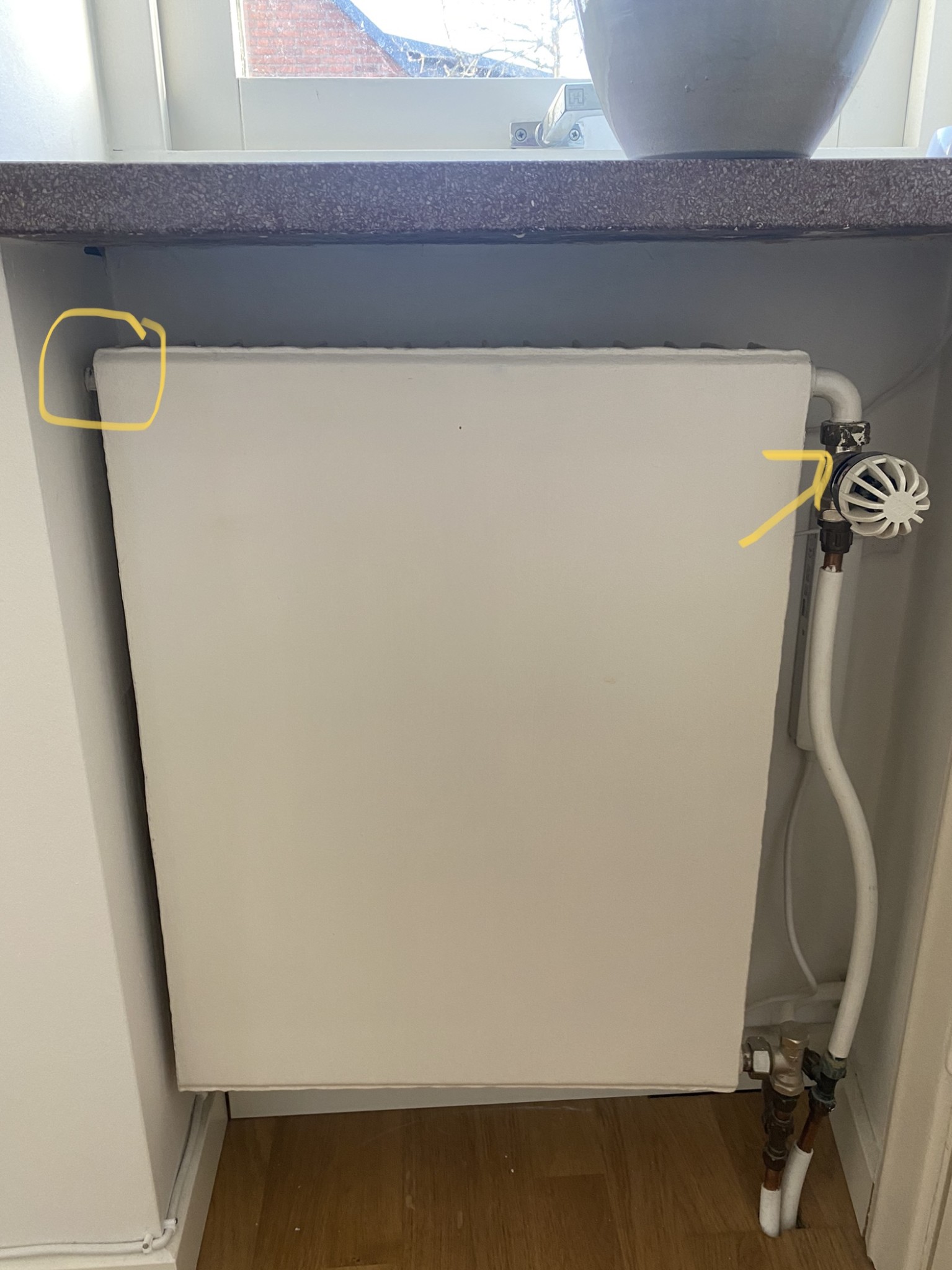 Har en radiator där det är minst sagt svårt att komma åt att lufta radiatorn. Går det att lufta på andra sidan där jag markerat? Är det då korrekt att stänga av termostaten och lossa försiktigt på muttern tills det börjar komma lite luft/vatten?