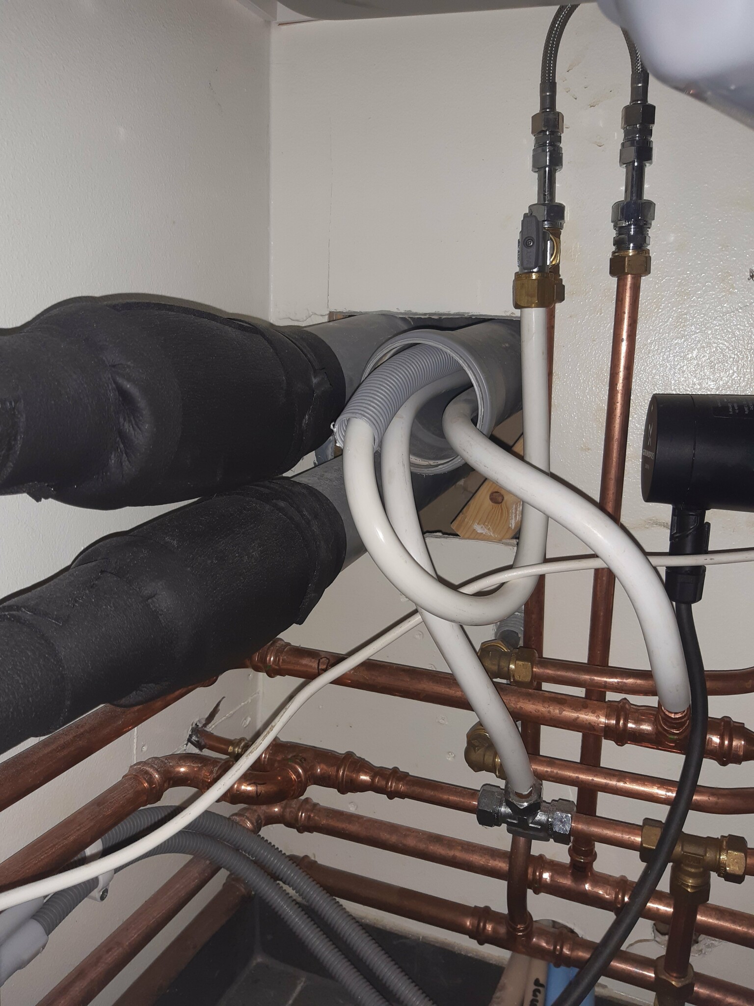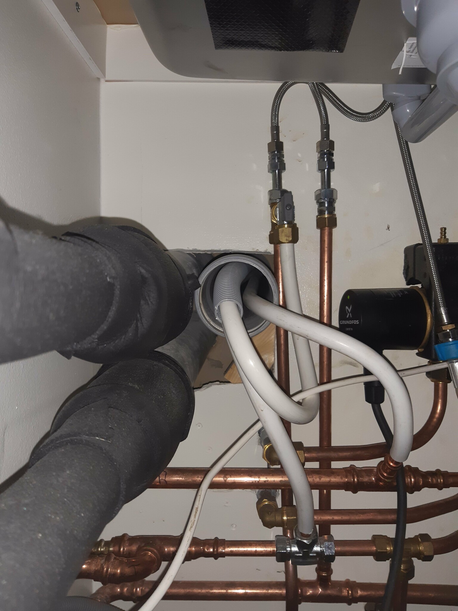 Flera små hål runt rör tänkte jag spackla igen men det finns ett cirka 20x20 cm stort hål några dm över golvet där bergvärmerör och ingående vatten är indraget (se bild). Mellan innervägg i gips och yttervägg (som vetter mot grus och sten eftersom huset är i suterräng) är det ett oisolerat hålrum på cirka 15 cm.