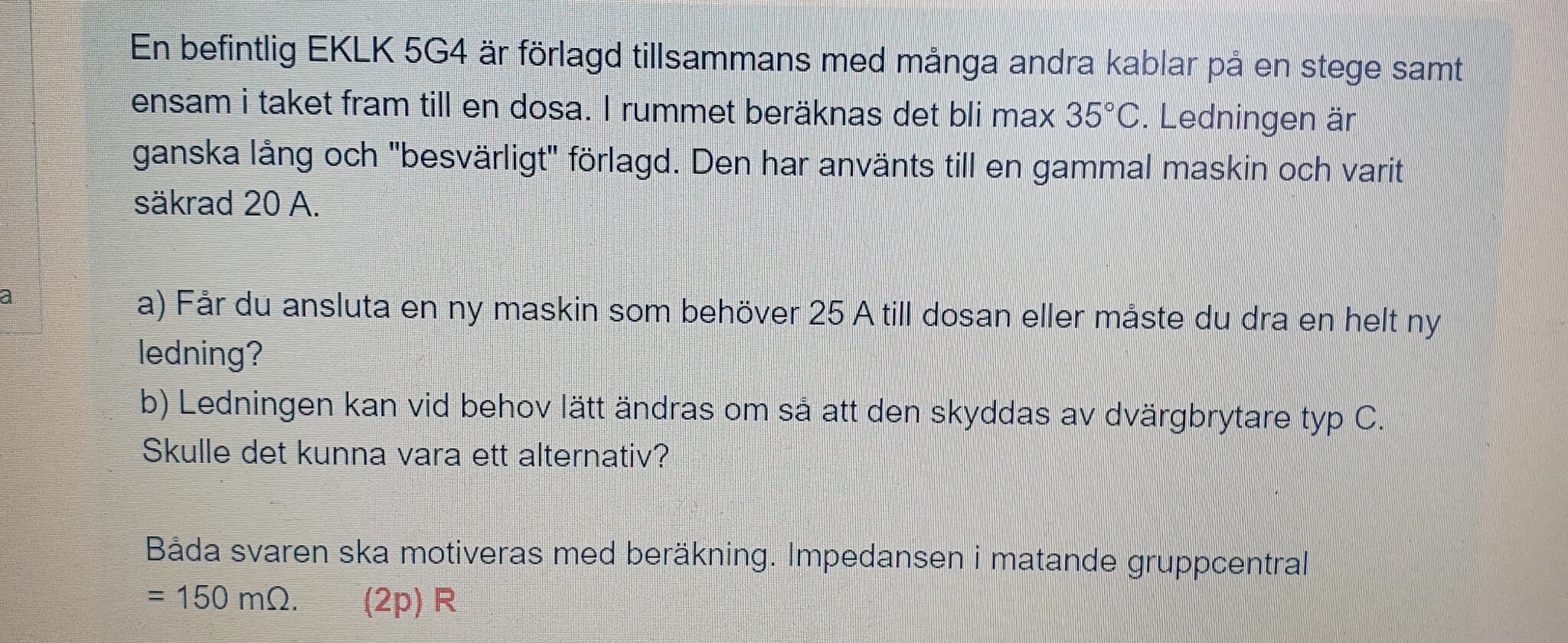 Om man tolkar fråga a) snävt så är det endast belastningsförmågan för kabeln som man är ute efter, dvs om det klarar en belastning på 25 A. Så du får titta i boken och leta efter belastningsförmågan och hur mycket den behöver reduceras pga omgivningstemperaturen.