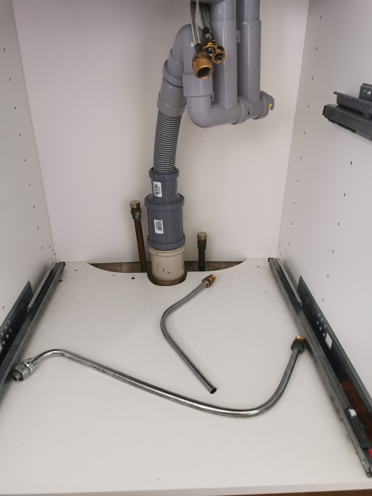 Ja båda rören i golvet måste användas, det ena är kallvatten och det andra varm. Bör vara som lordi säger, koppla vänstra röret på röd/vänster på Blandaren och högra röret på höger slang och kom ihåg avloppet till diskmaskinen