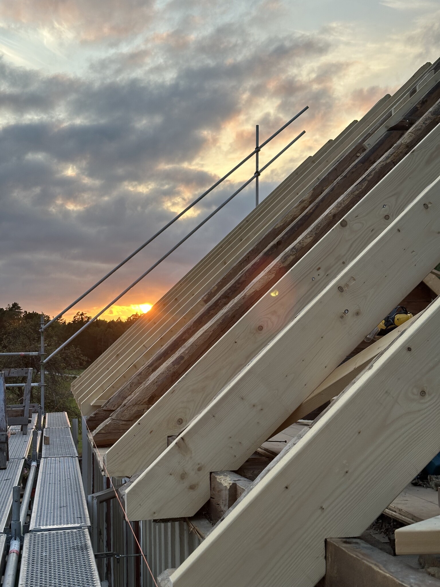 Hej! Läst mycket tidigare men aldrig lagt ut något men nu behöver jag lite tips. Håller på att lägga nytt tak på vårt hus från 1850-60 talet. Har riktat och förstärkt de gamla takstolarna och ska nu sätta takfotsbrädan innan jag börjar med råspont. Har väldigt lite byggerfarenhet men är rätt händig av mig så löser det mesta med lite info och guidning från de som kan men det innebär också att jag kör fast på märkliga detaljer som kanske är en självklarhet för de mer erfarna. Har en duktig byggare som bistår med väldigt mycket kunskap men vill inte heller lasta honom med allt för mycket små detaljfrågor.