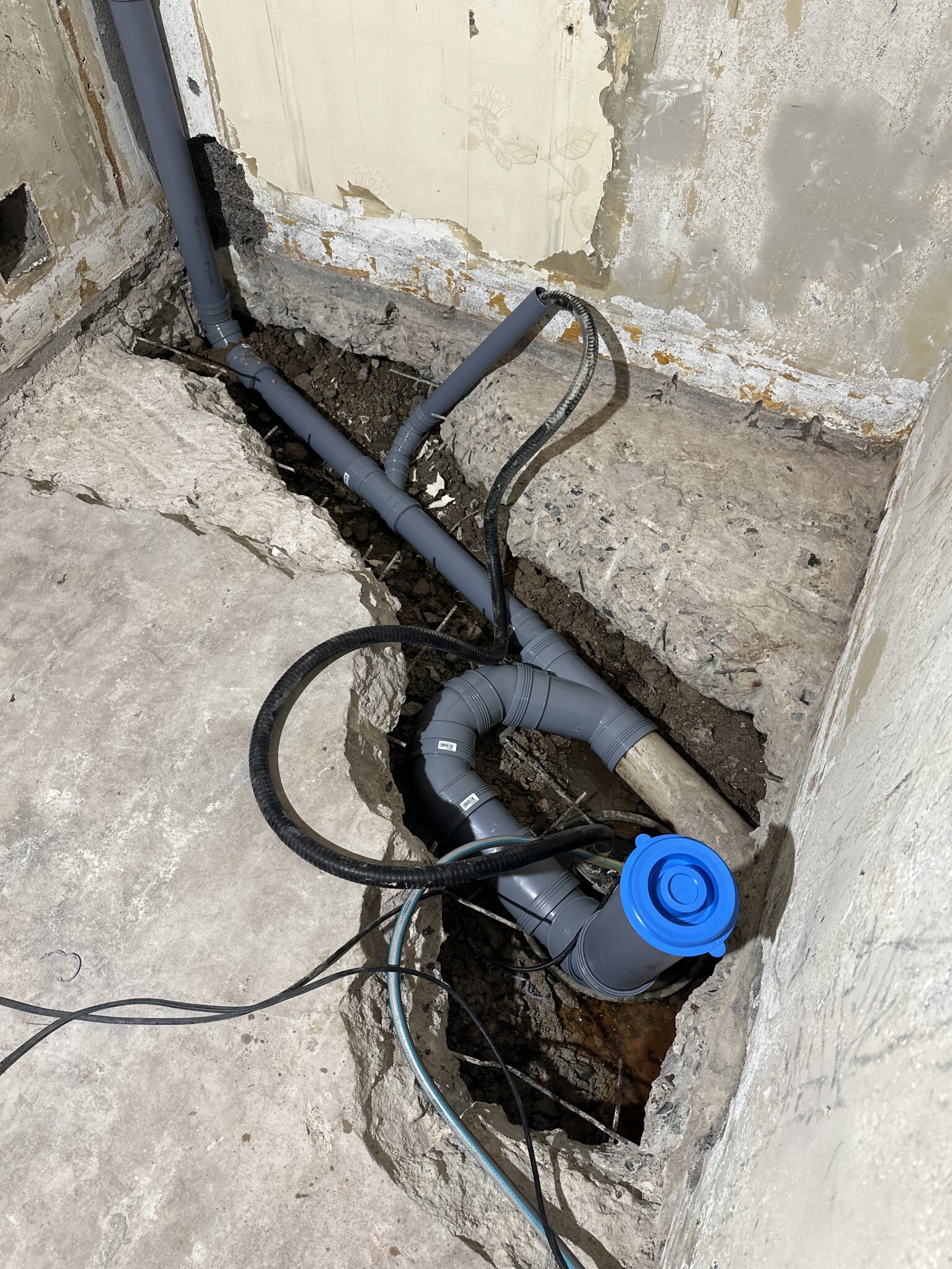 Hej, har ett hus med källare som är byggt 1974. I källaren finns en bastu och utanför den ett ”omklädningsrum” enligt orginalritningen. Vi ska nu bygga om det till ett badrum. Av den anledningen så bilade vi upp delar av bottenplattan för att lägga ner avlopp till blivande duschar, handfat och toalett.