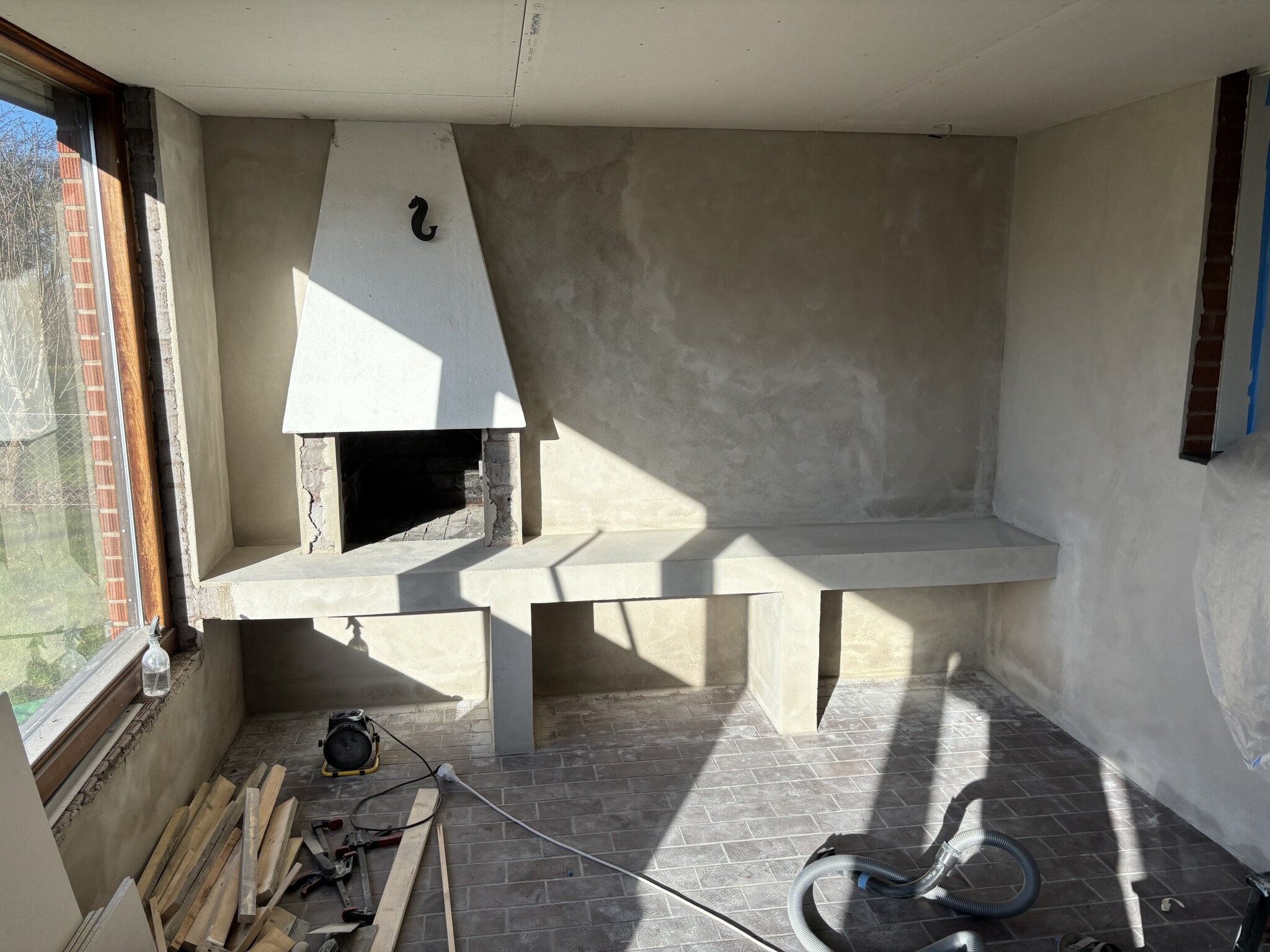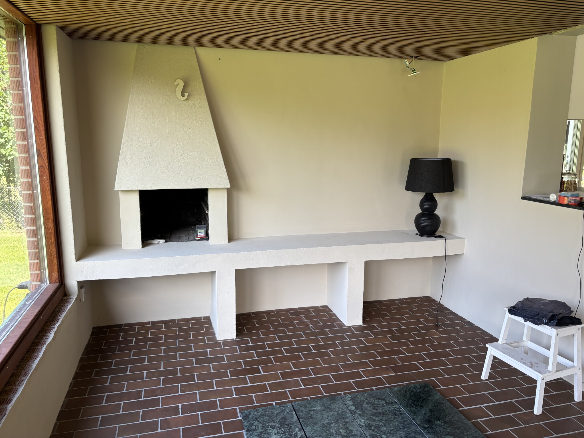 Idag har jag målat på putsen inuti spisen och runt dörren pga ändrade planer.
