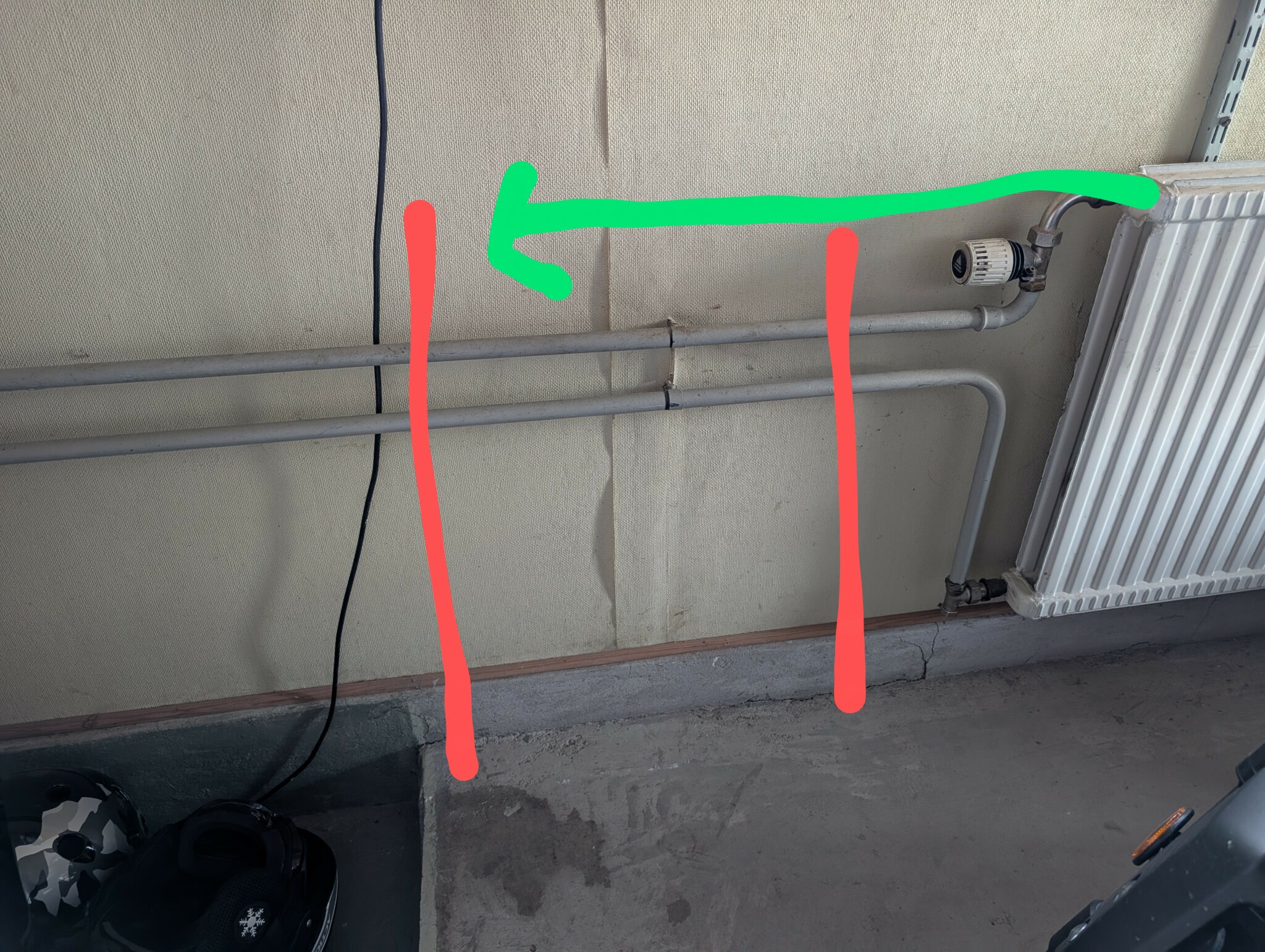 Behöver flytta radiatorn som syns i bild ca 80 cm till vänster på samma vägg, dvs till den röda linjen där jag också tänker kapa rören.. Kapar sedan vid den andra röda linjen också (ca 80cm) Men hur ska dessa enklast skarvas sen? Rören är 21mm.
