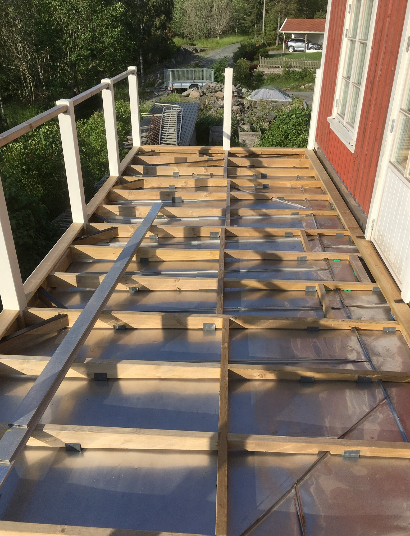 Du får göra den flytande på plåttäckningen och förankra i väggen balkongen sticker ut ifrån. Trallen fästs i reglar som ställs på låga fötter av lämplig plast. Vad är det under plåttäckningen?
