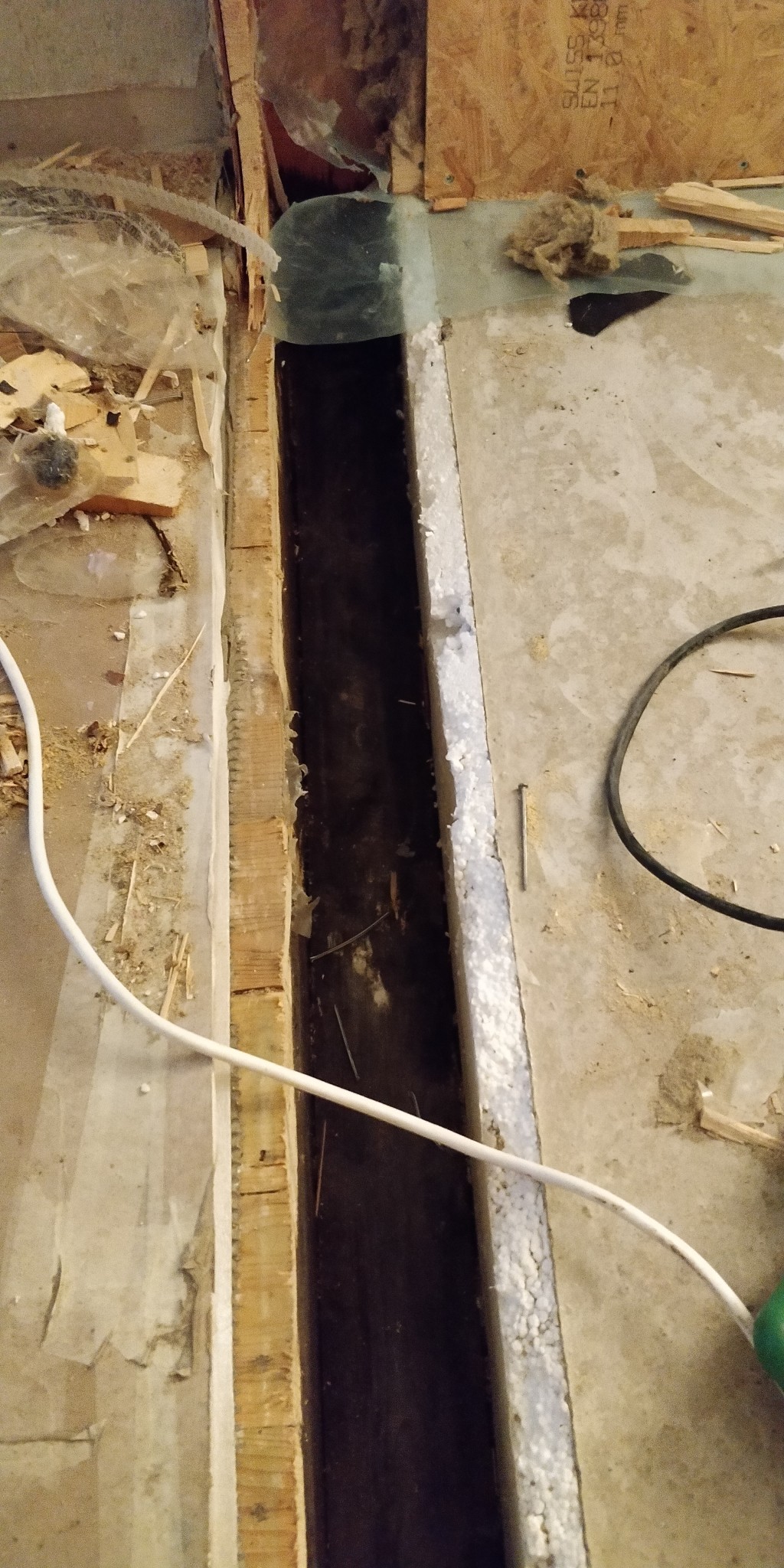 I botten är det gammal stomme till det gamla huset, på ena sidan är det golvregel och på den andra sidan betong.