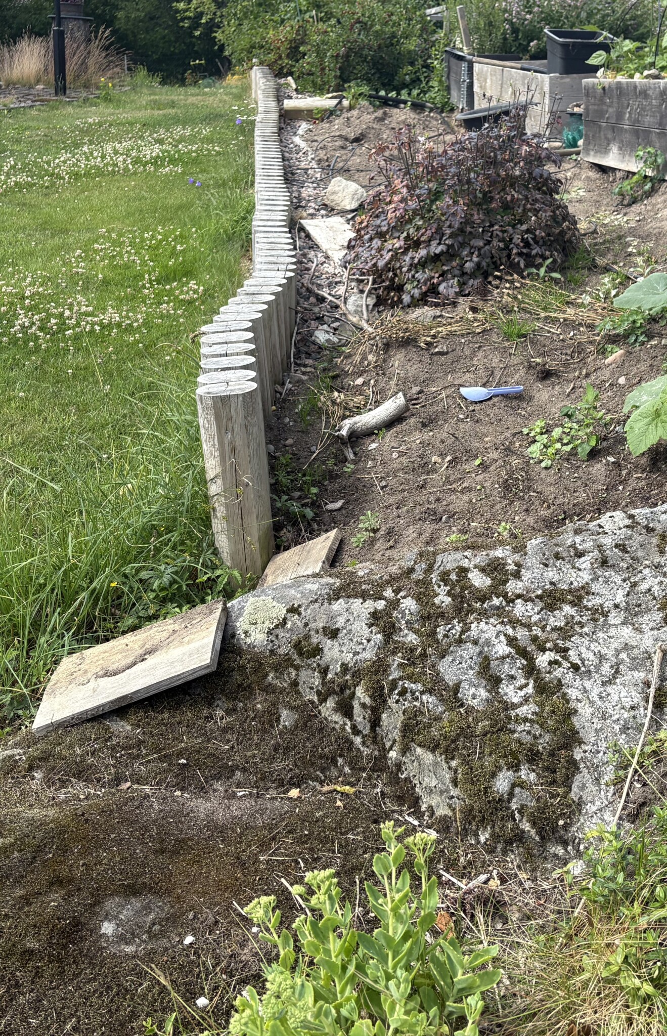 Sen tror jag du behöver förankra det stående timret med geonät eller något liknande. Jag gissar att planen är att fylla på mer makadam och jord.