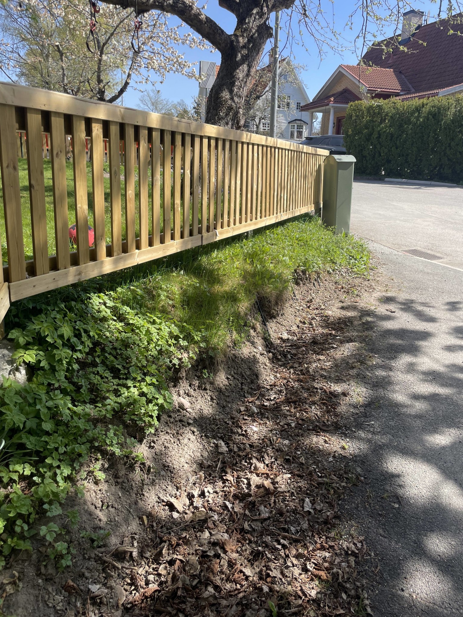 Jag har en liten (30-40 cm hög?) grässlänt vid min utfart som går från min asfalt upp mot grannens staket som jag skulle vilja snygga tlll. Så här ser det ut nu.