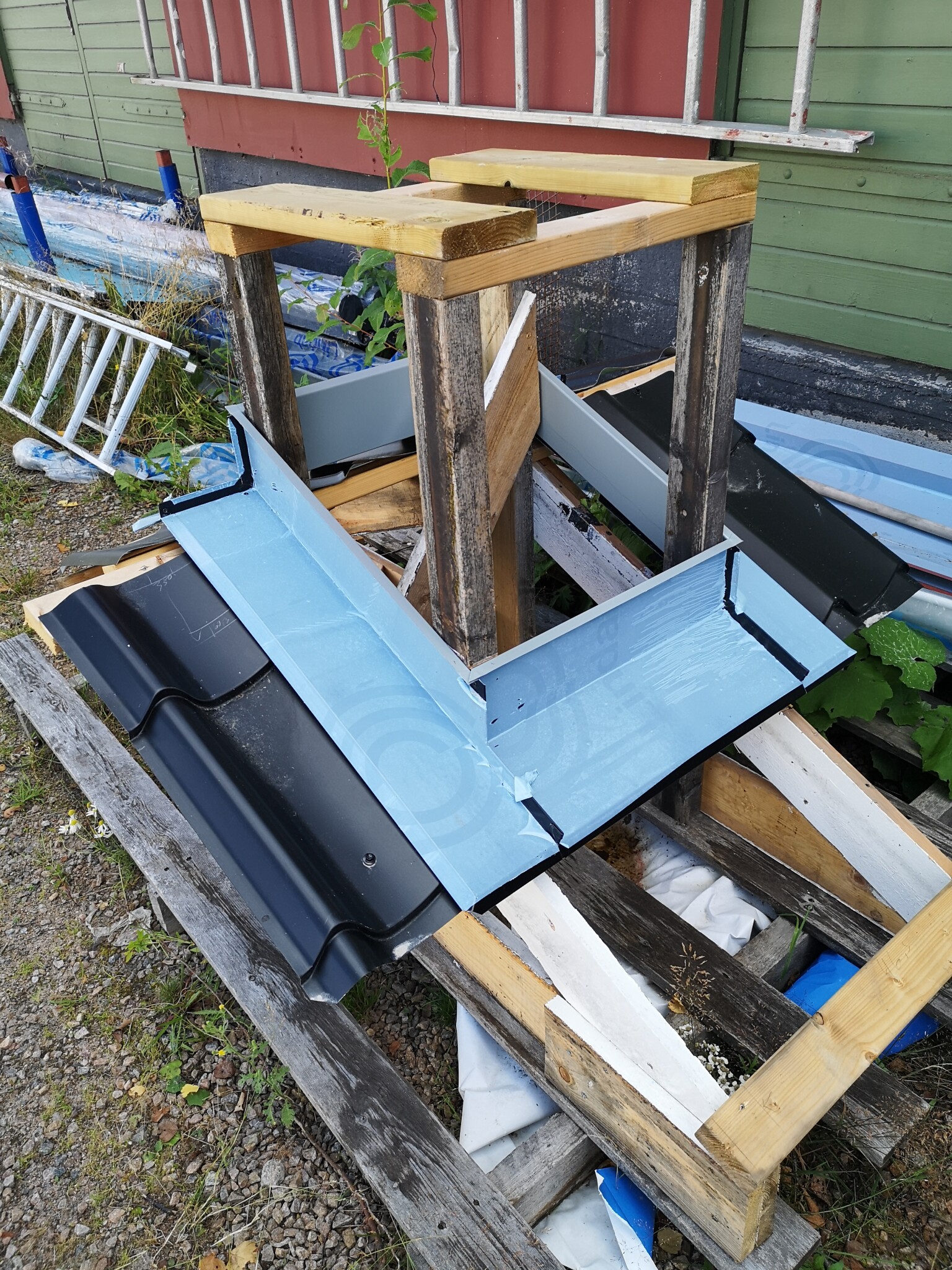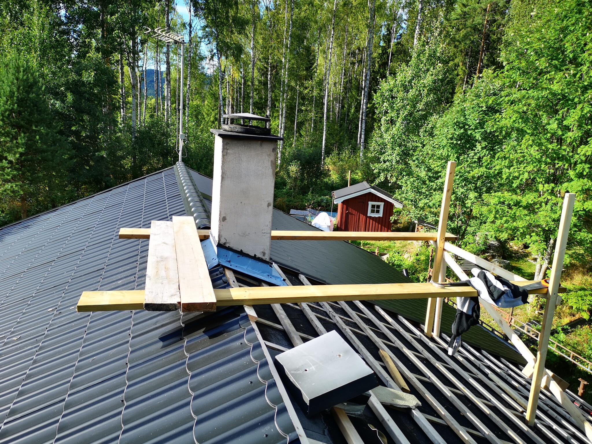Åkte till en plåtslagare som gjorde ett skorstensbeslag på modellen, som s a s träddes på befintlig skorsten ovan det nya Planjataket.