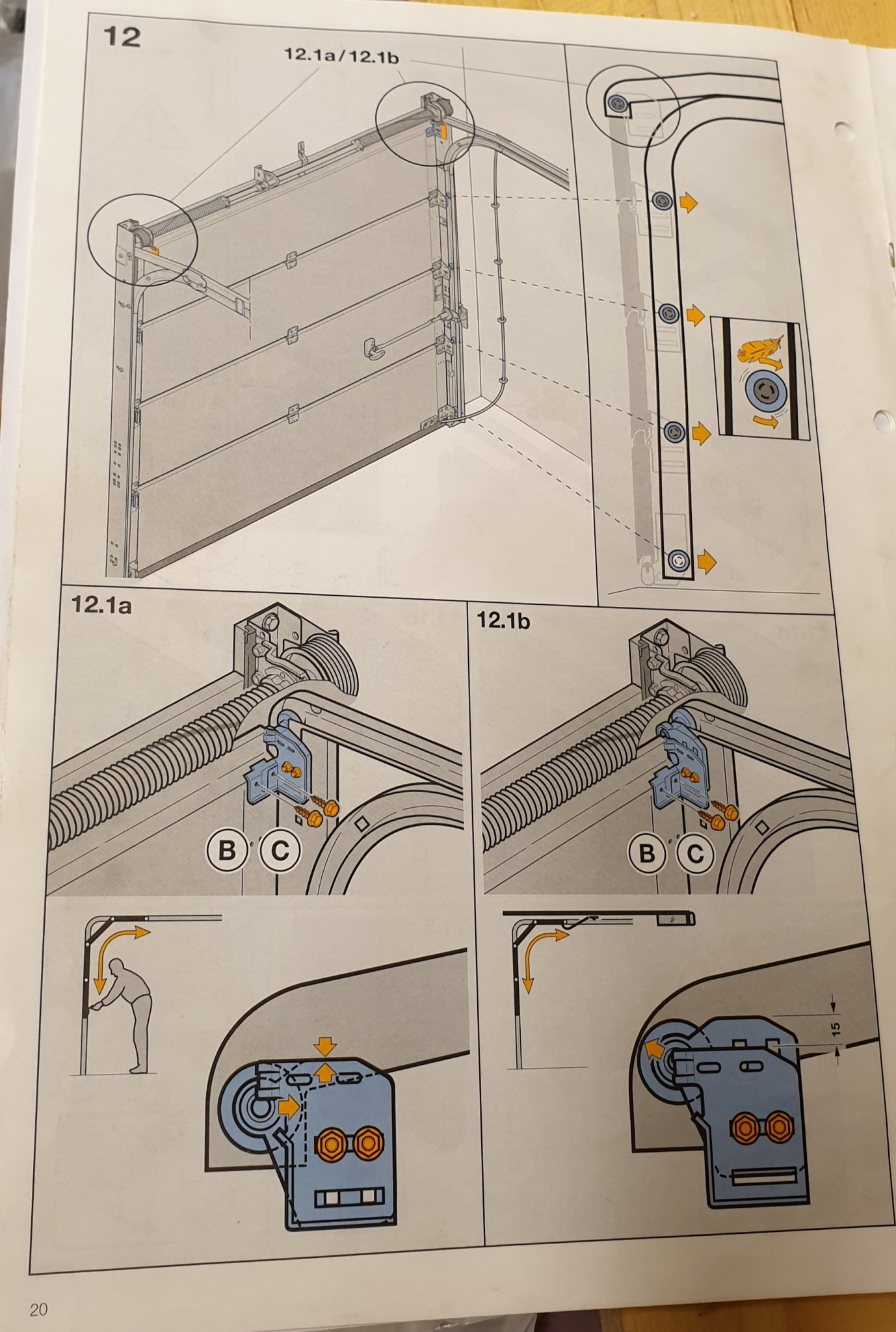 du börjar förstås med att montera alla portbladen och hjulen med vajrarna som sitter i nedersta bladet därefter lyfter du upp porten i öppet läge ( obs väldigt tungt eftersom fjädrarna inte är kopplade )och låser fast den där jag brukar använda en tving eller en bräda.