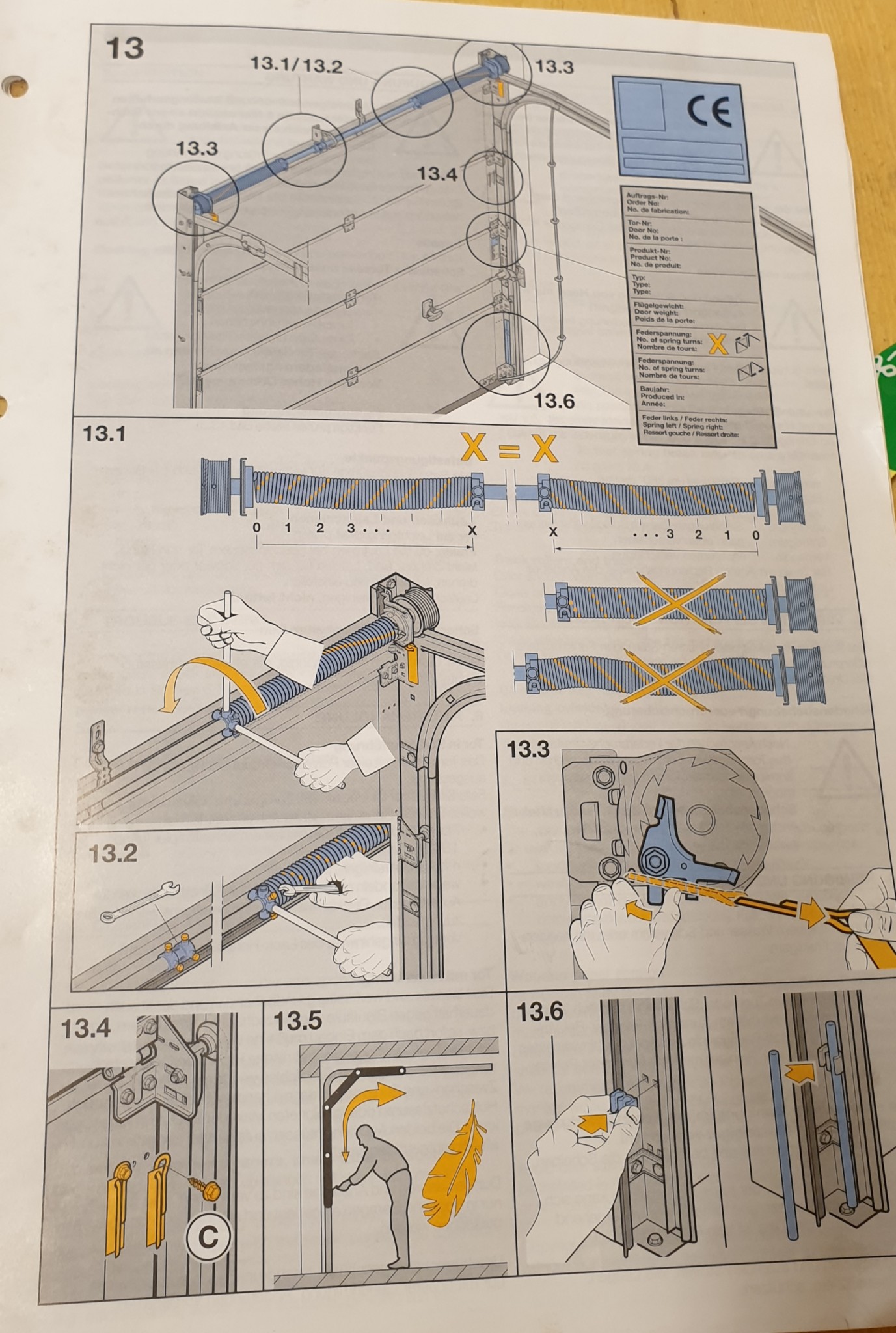 och skruva fast,spänn sen den andra fjädern.vet inte hur hörmann gör men på portar jag monterat står fjädervarv angett på en lapp på portbladet.oftast 7-8varv.