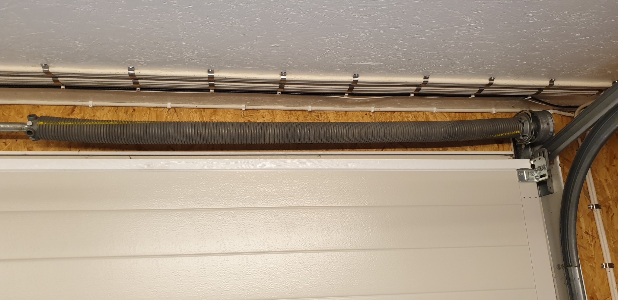 antingen räknar man varven eller ser på markeringarna på fjädern.porten ska gå lätt att öppna men inte åka upp av sig själv,man kan ev få slacka eller efterspänna.