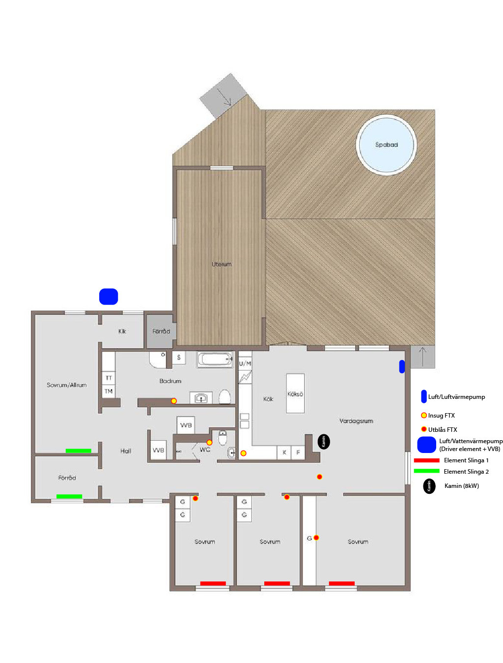 Det sitter inget element alls i Vardagsrummet (vilket jag undrar varför tidigare ägare inte drog in när de gjorde om värmesystemet...men undrar också om placeringen av elementet i Sovrum/Allrum längst bort till vänster, borde det inte sitta under (eller nära) fönstret, istället för på vägg mot annat uppvärmt rum? Finns ej heller ventilation eller FTX i det rummet...)