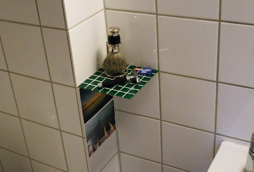 Jag vill inte borra i kaklet, för det blir så fult om jag vill ta bort hyllan nån gång.
