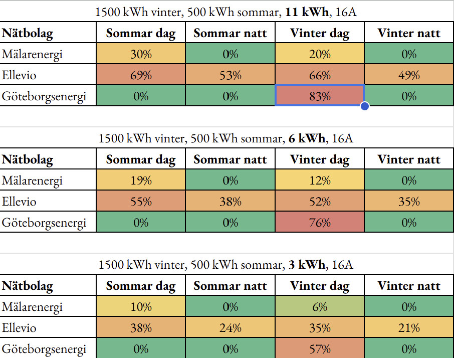 Jag väljer att titta på hur stor andel av nätavgiften som effektavgiften utgör, vid olika tider och årstider för 3, 6 och 11 kWh i högsta förbrukning.