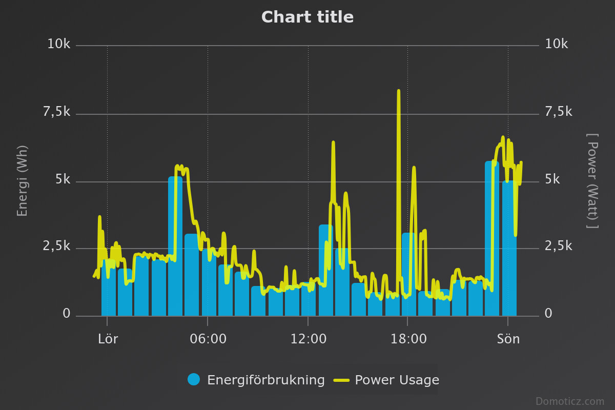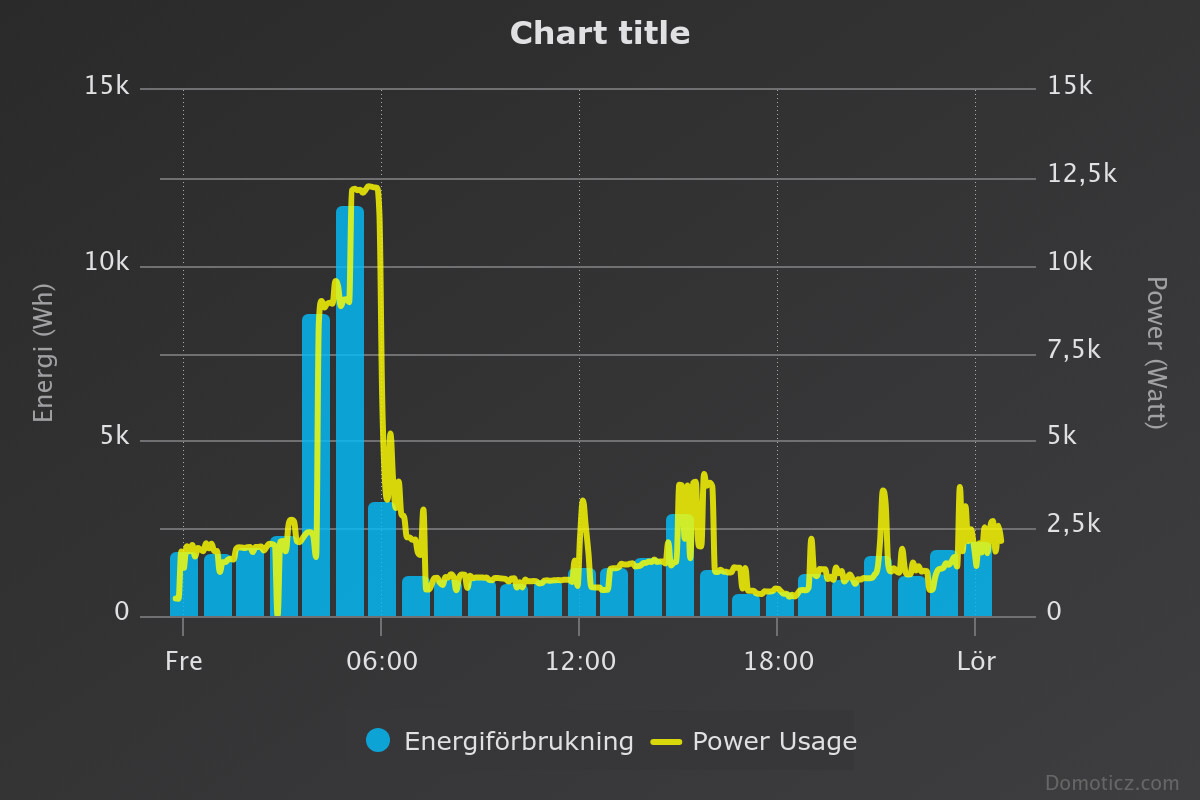 Som man ser så är ju effektspikarna väldigt höga (de gula strecken), men även energiförbrukningen per timme (de blå staplarna) drar ju iväg hos oss.