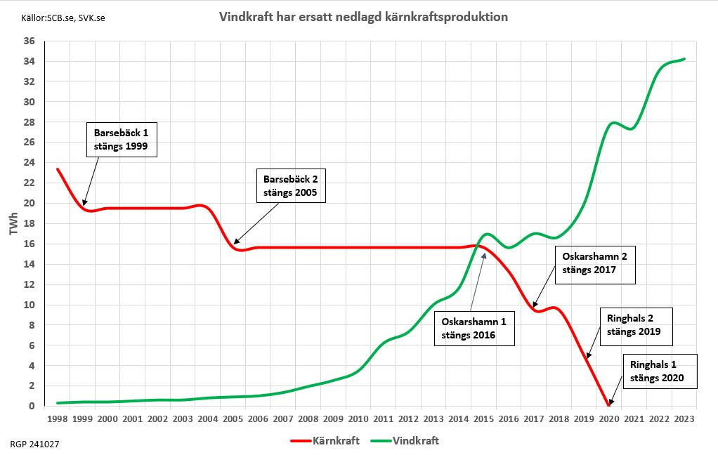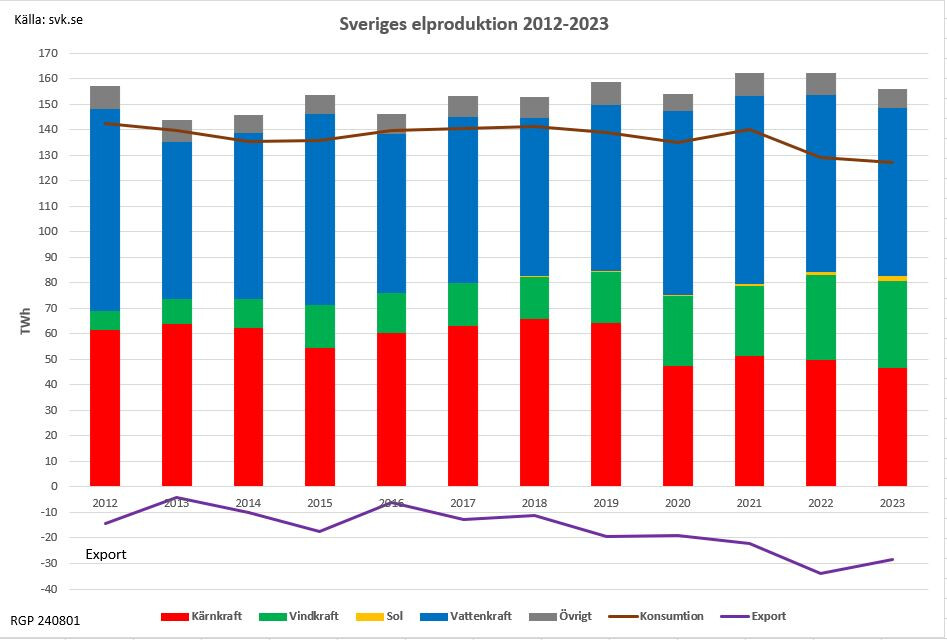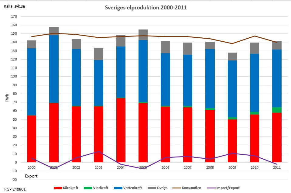 Den här bilden är intressant när folk börjar prata om att vi har förstört allt genom att lägga ner fullt fungerande kärnkraft och ersätta med vindkraft. Observera dock att detta enbart visar den nedlagda kärnkraften. Kvarvarande reaktorer har höjt sin effekt så som ni ser av de följande två diagrammen har nedläggningarna inte gjort så stor åverkan på totalen. Man kan också se att vi kunnat öka exporten rejält efter nedläggningen, vilket ju beror både på att vi haft större överskott och på att det byggts fler ledningar att exportera genom.spikplanka skrev: