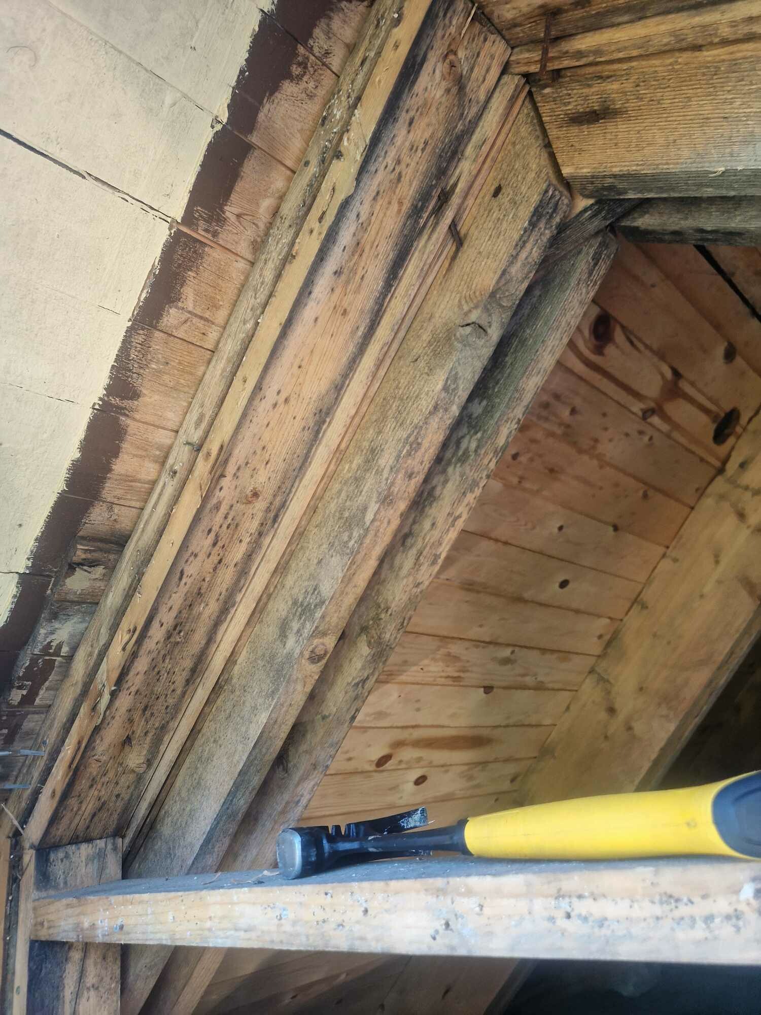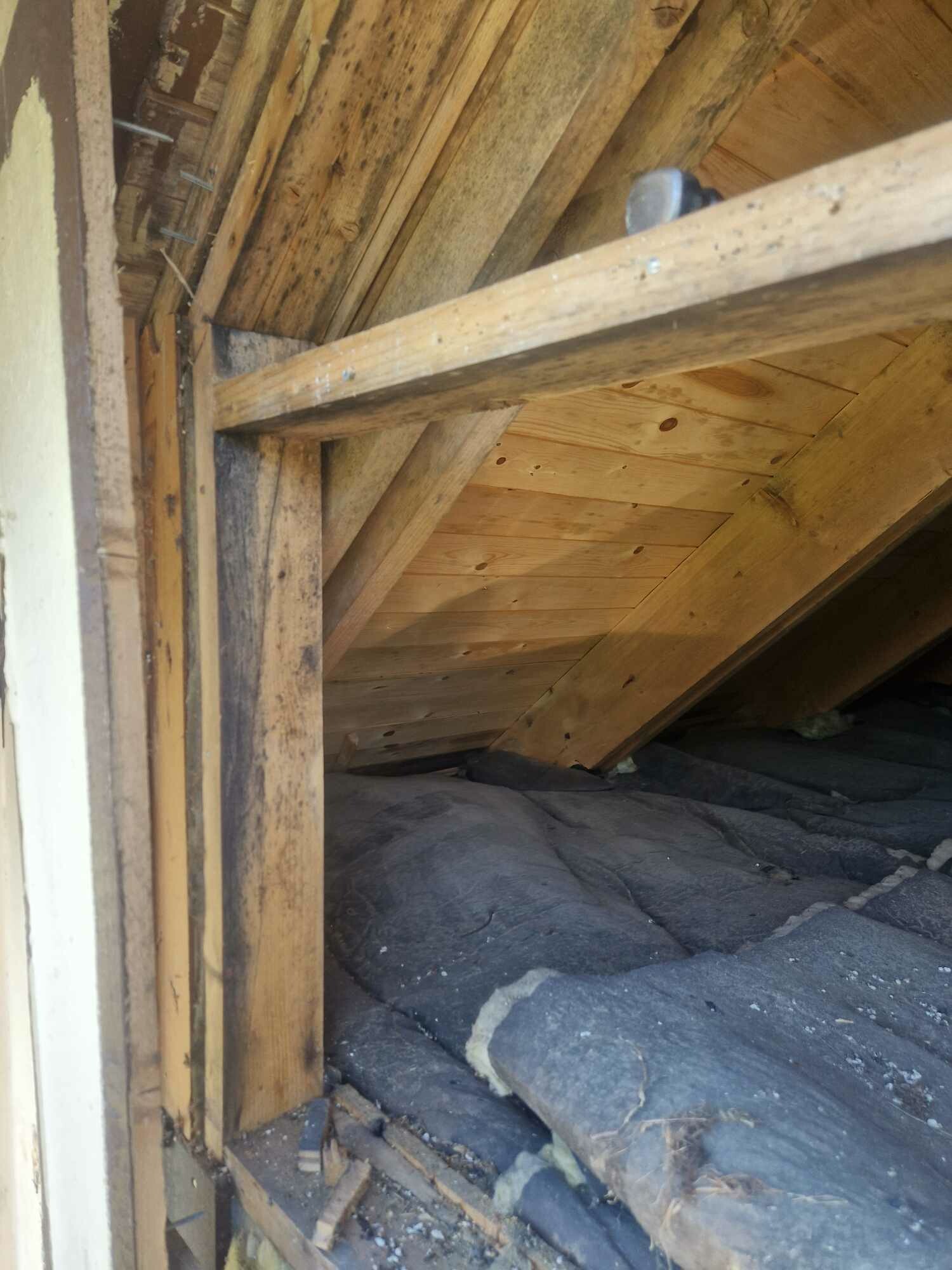 Vi är mitt i rivning av fasaden för byte. När vi närmade oss nock möttes vi av en masonitskiva och en takstol som någon gång utsatts för fukt.