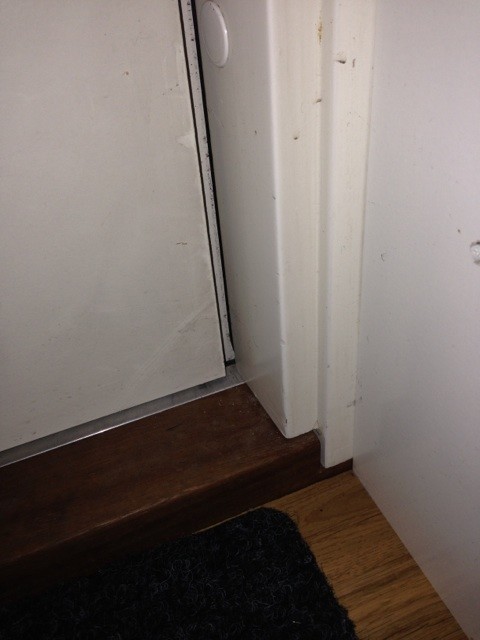 I underkant av dörren har jag också satt en extra tätlist på samma sätt som i bakkant då dörren har en extra fals som inte var nyttjad. Den gamla listen i bottenkant (monterad i spår på tröskeln) sitter kvar, men är gammal och hård och sliten så den tätar inte så bra. Den nya listen hjälper till och tätar nertill. Listerna i botten av dörr/tröskel slits ju extremt hårt så de bör nog ses över tämligen ofta. Ser att min nya list nu är bortsliten de yttre cm mot handtagssidan så det är uppenbarligen dags att skarva i en ny bit där.