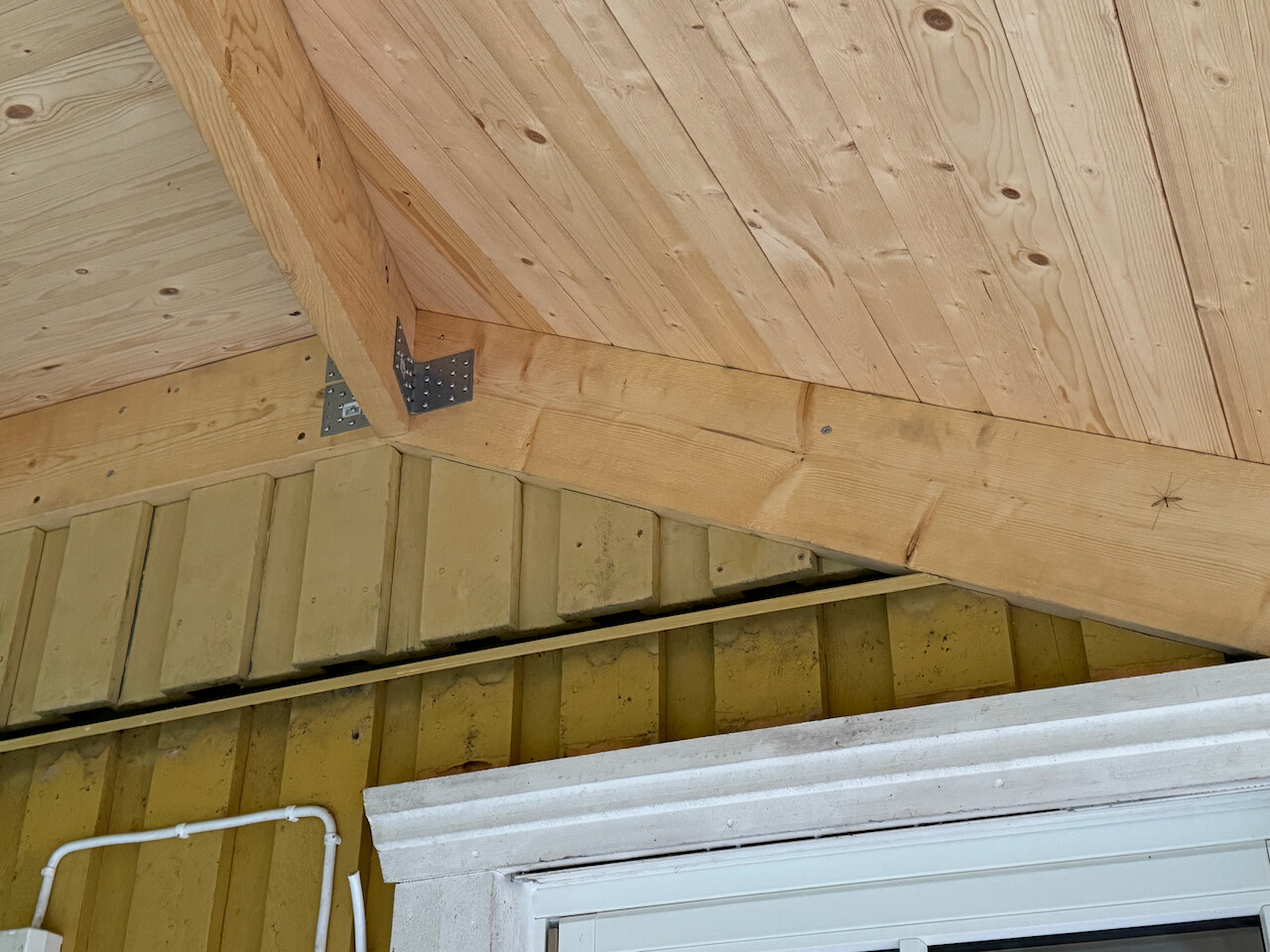 Oct ja, ni som ser bilderna ser att jag gjort byggfel som vissa andra där jag försent förstått det där med takvinklar på valmade tak och den påverkan det får på överhänget åt de olika sidorna. Nu blir det lite olika överhäng åt de två sidorna, vilket inte var tanken från början.