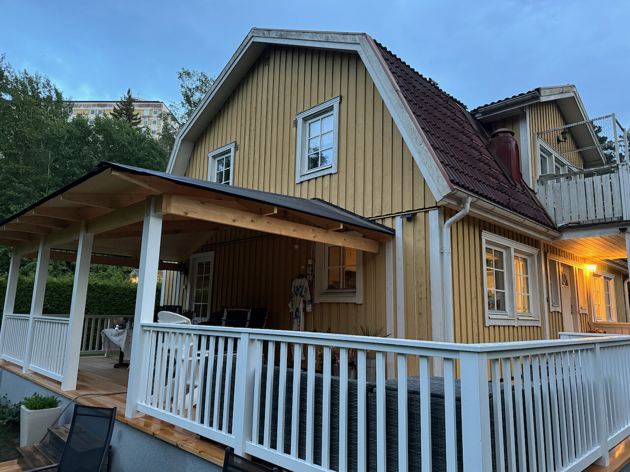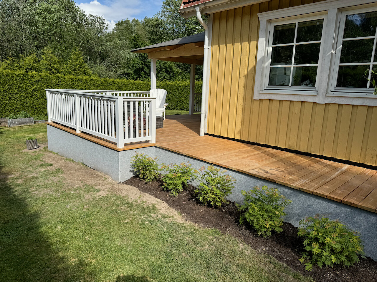 Jag har rivit en gammal altan och byggt nytt (se bilder). Altandäck och räcke är klart. Taket är just nu bara lagt med underlagspapp som tätats provisoriskt mot husväggen. Ytpapp mataki självtäck 3 med bättre tätning med plåtar mot husvägg ska ske nu när jag får semester. Fotplåt, hängrännor etc ska också dit vid takfoten..