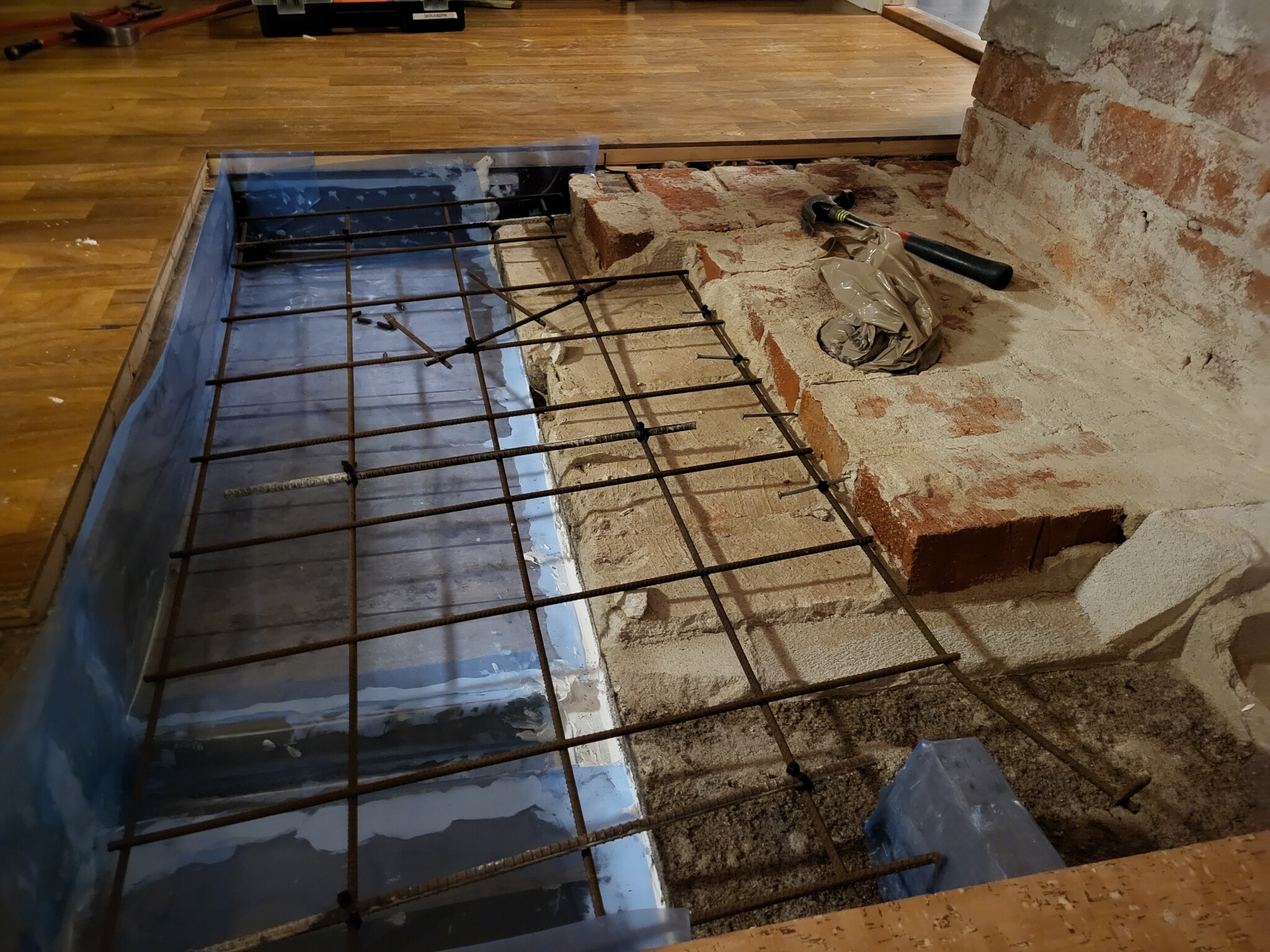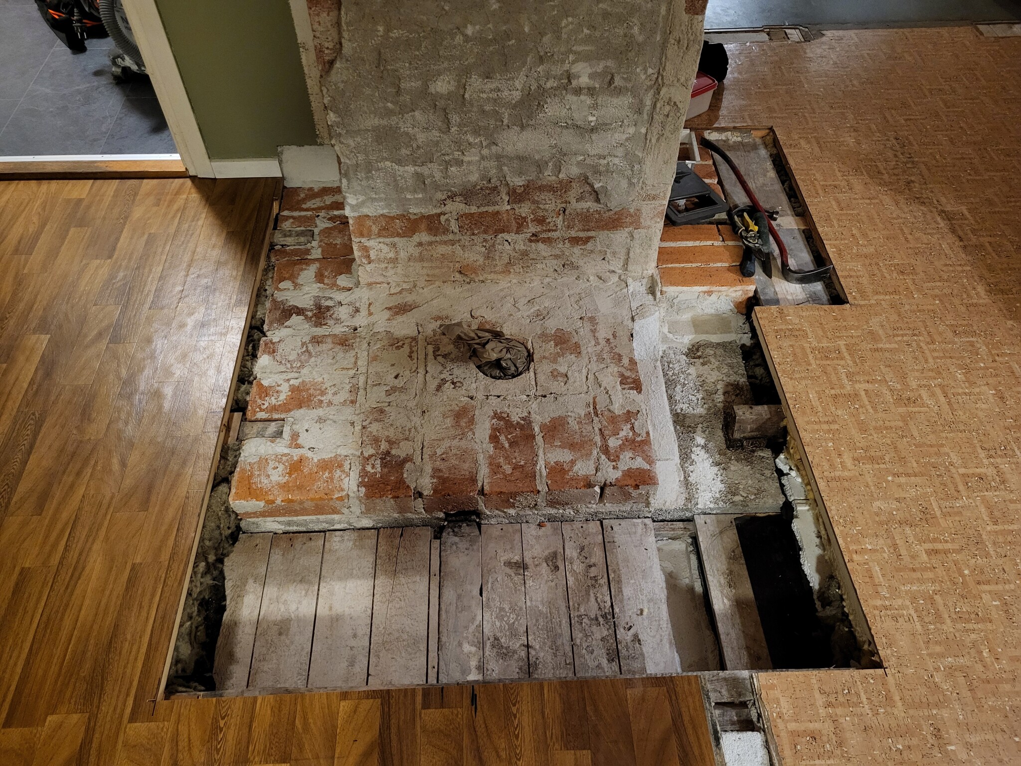 Kaminen står stadigt på en del av murstocken och golvreglar vilar också delvis på den.