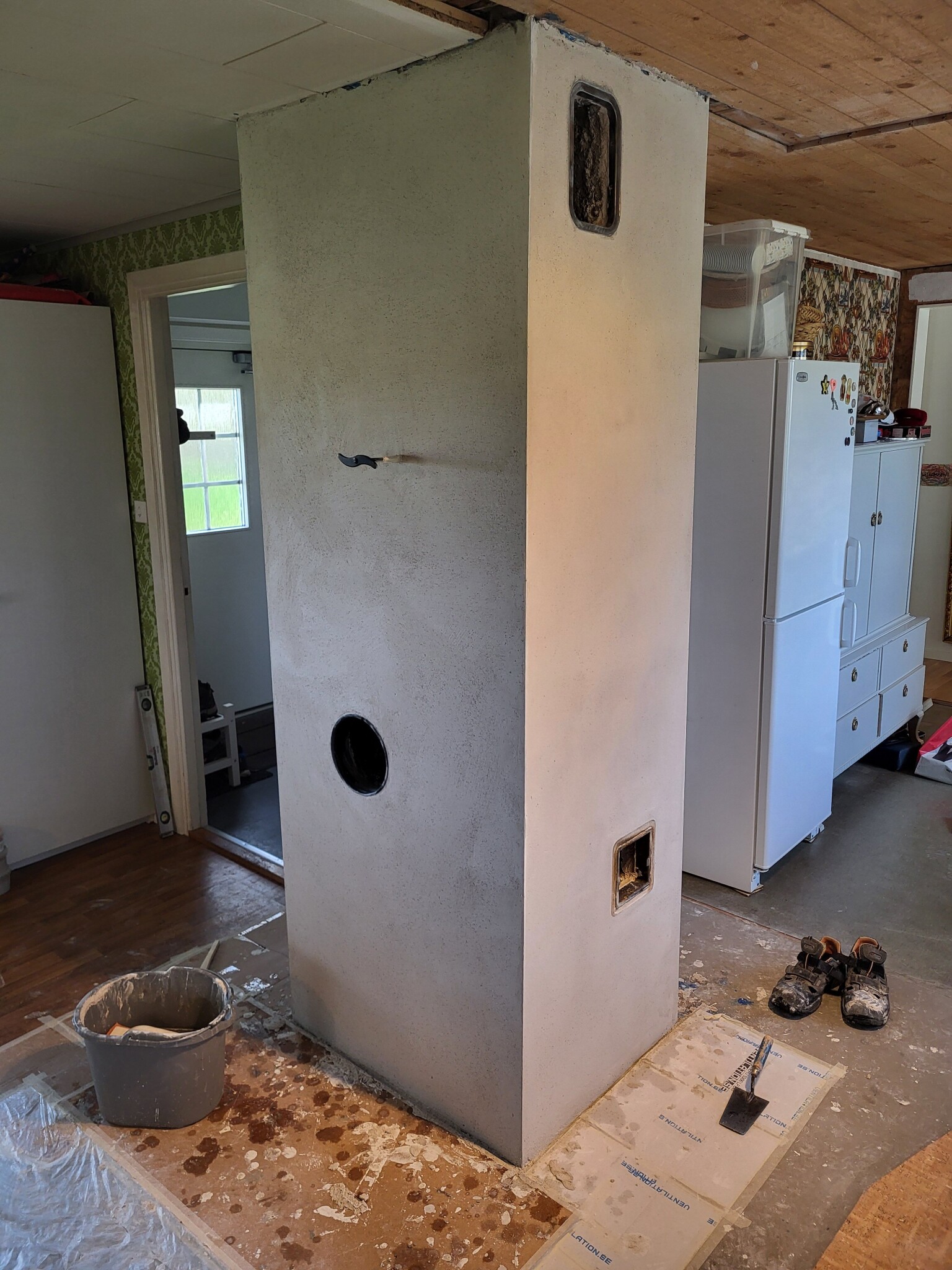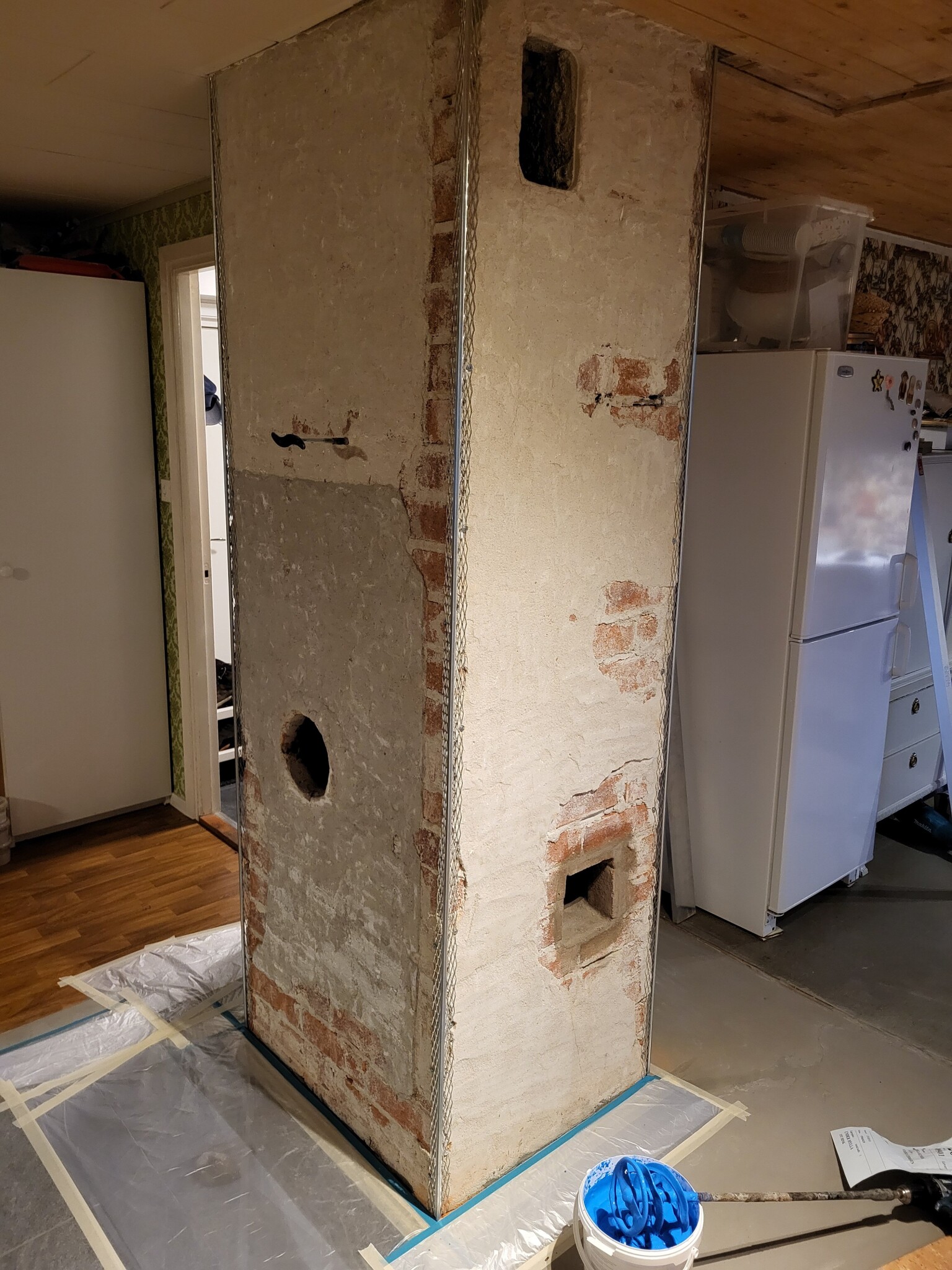 Det som syns på senaste bilden är inte puts, utan någonting hårdare. Det satt ett lager mexisten precis bakom kaminen som jag knackat bort.