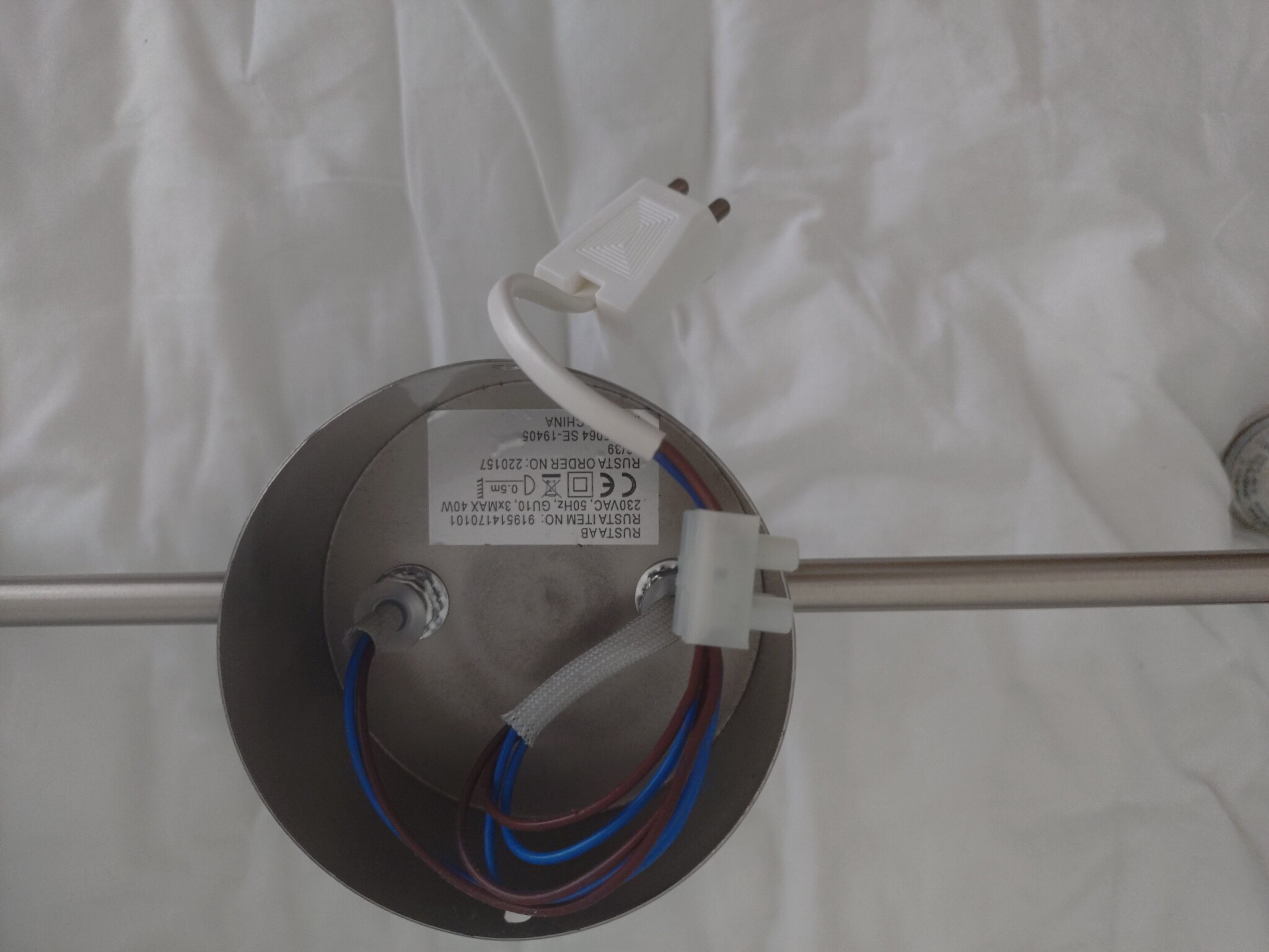 Den armaturen bör du lämna tillbaka till Rusta och påpeka att den inte får säljas i detta utförande. Hota med anmälan till elsäkerhetsverket om de inte plockar bort den.