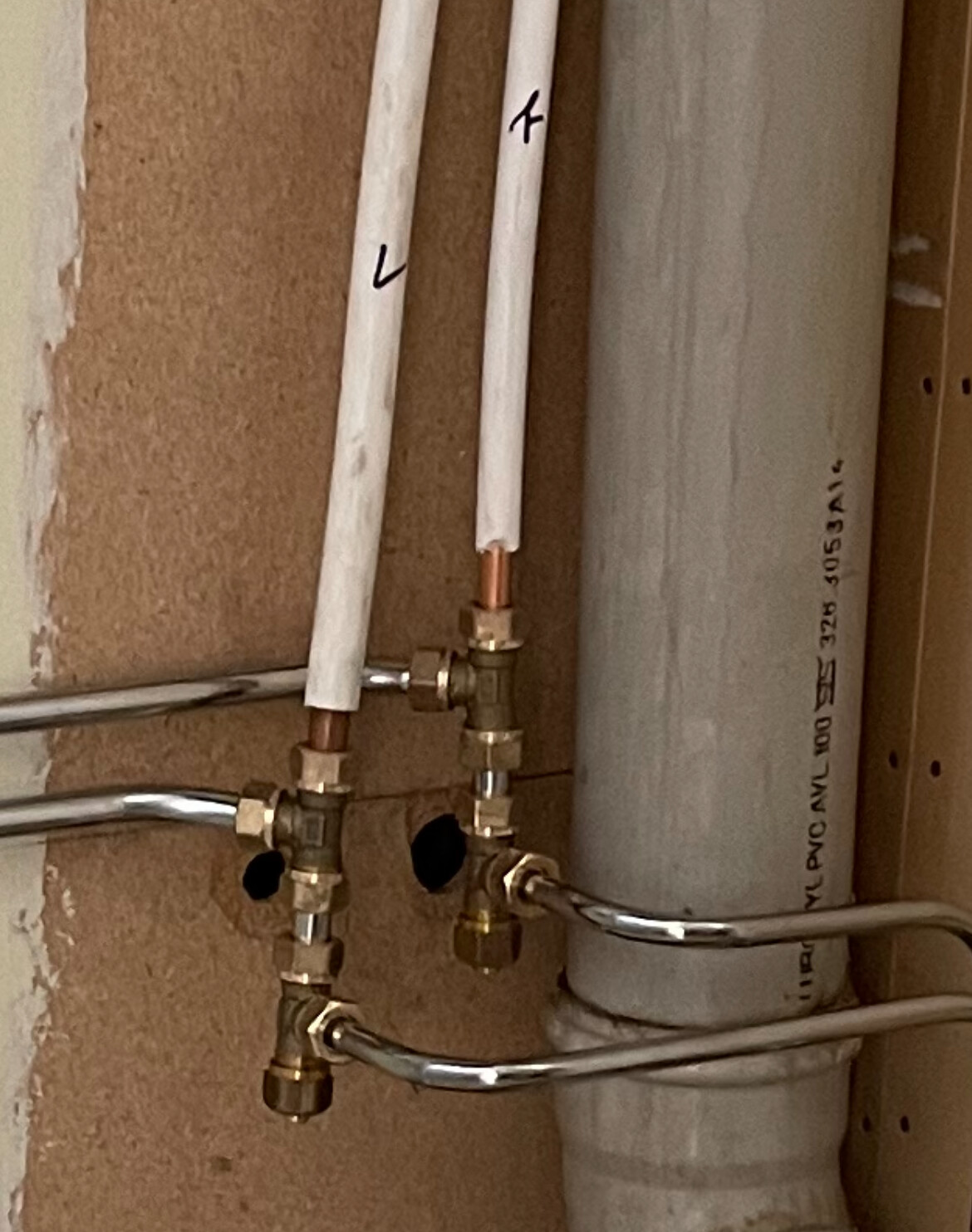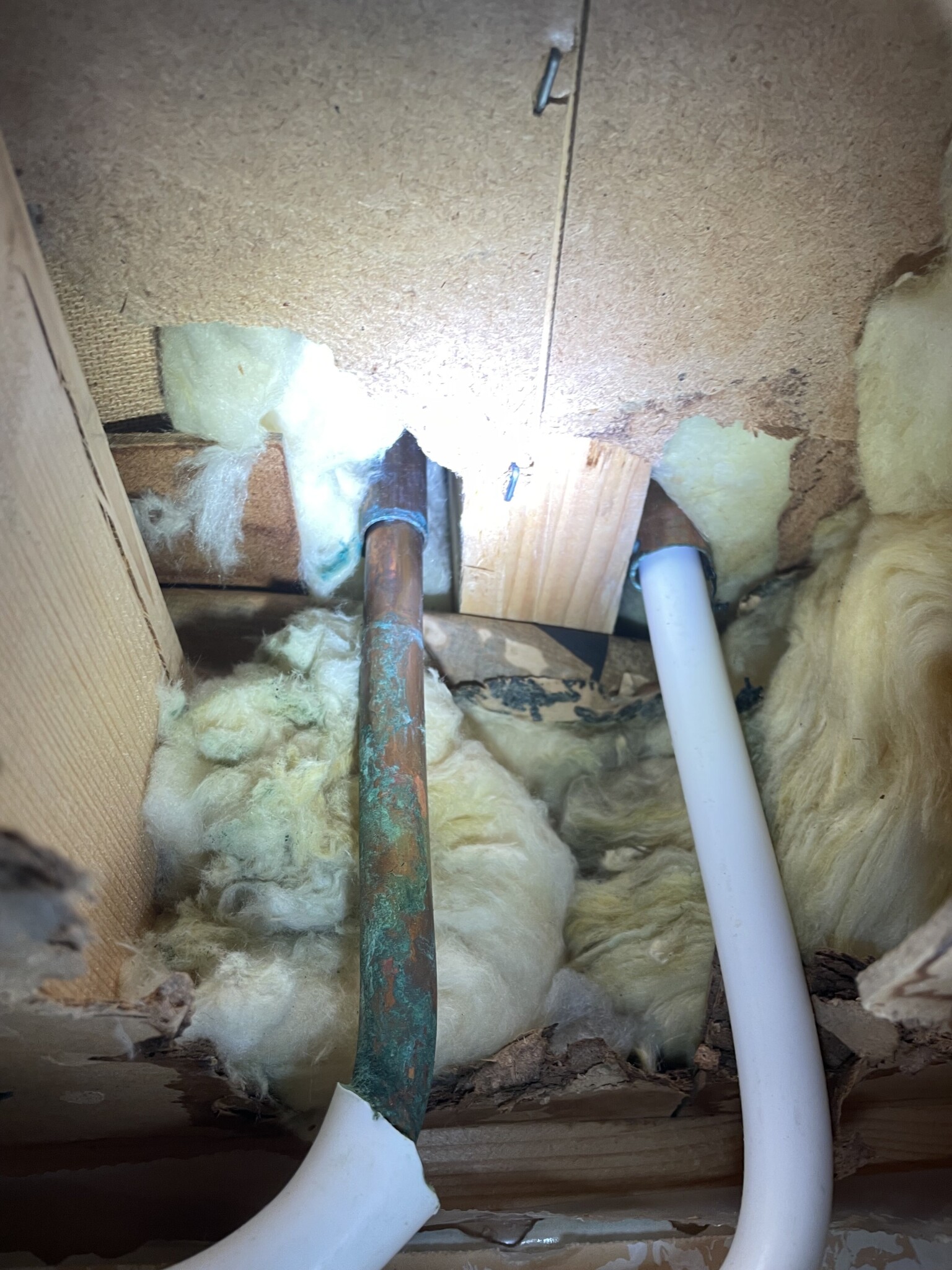 Går upp till badrum. Det gröna går att skrapa bort men frågan är hur det ser ut nedåt under plasten… 🤔 Ser ok ut där de kommer ut vid varmvattenberedaren. Finns inga läckor, takplattan under rören helt torr utan fläckar.