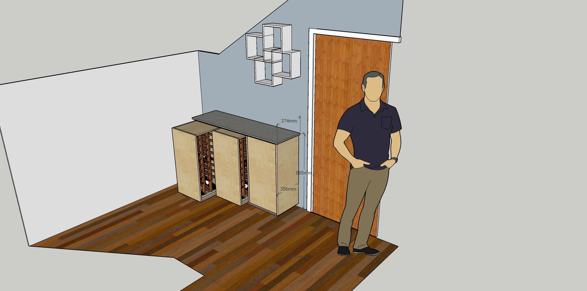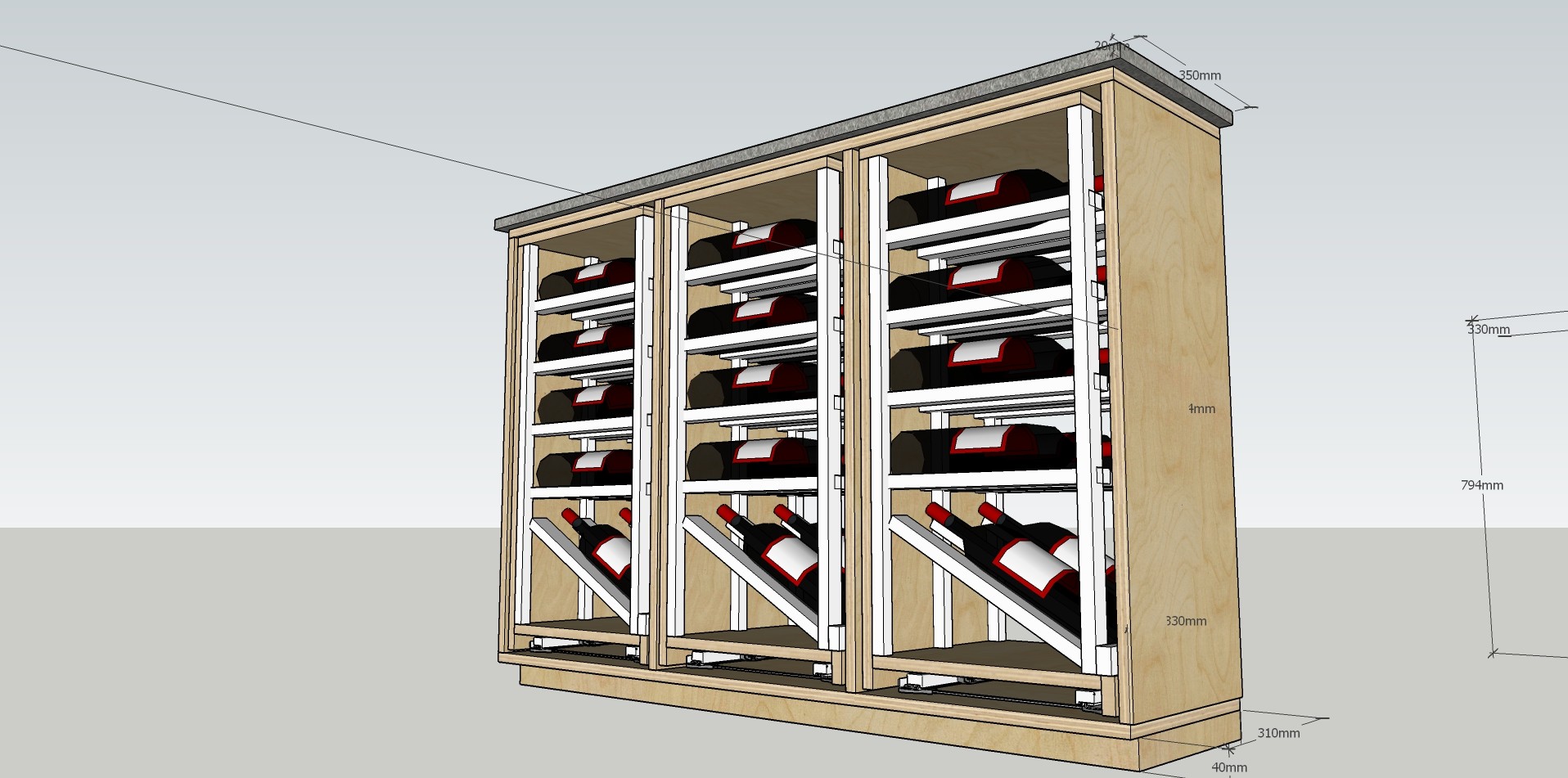 Hej Jag ska bygga ett vinskåp (se bilder) med tre utdragbara "lådor" (höjd ca 80 cm, bred och djup ca 35 cm) med tre lådexpansioner/expansionsbeslag. Varje del kommer att husera 10 vinflaskor. Det innebär att vikten blir ca 20 kg per "låda". Jag vill att utdraget ska kännas stabilt (inte vingligt) när man drar ut den och sedan ha ett mjukstängande när man skjuter in lådan efteråt. Materialet blir Plywood 18 mm, björk som vinhållare och en betongtopp.