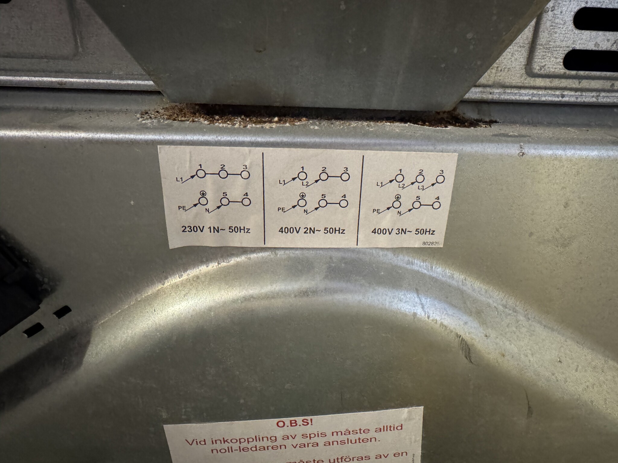 Hur som helst. Vid köp uppgav säljaren att spisen var skakig, vilket jag accepterade vid köp. Det var förrförra ägaren som satte in spisen, och jag börjar nu misstänka att den är trefas. (Granntanterna skvallrade på städdagen om att han tydligen var väldigt egensinnig.) Bifogar foto av etiketten på spisens baksida.